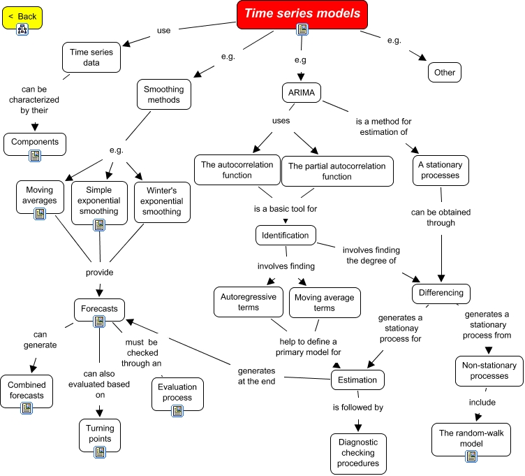 This Concept Map, created with IHMC CmapTools, has information related to: Time series models, ARIMA is a method for estimation of A stationary processes, Autoregressive terms help to define a primary model for Estimation, The autocorrelation function is a basic tool for Identification, Identification involves finding Autoregressive terms, Smoothing methods e.g. Simple exponential smoothing, Smoothing methods e.g. Moving averages, Identification involves finding Moving average terms, Non-stationary processes include The random-walk model, Forecasts must be checked through an Evaluation process, Estimation is followed by Diagnostic checking procedures, A stationary processes can be obtained through Differencing, Time series models use Time series data, Differencing generates a stationay process for Estimation, Time series models e.g. Other, Simple exponential smoothing provide Forecasts, Time series models e.g ARIMA, Differencing generates a stationary process from Non-stationary processes, ARIMA uses The autocorrelation function, ARIMA uses The partial autocorrelation function, Forecasts can also evaluated based on Turning points