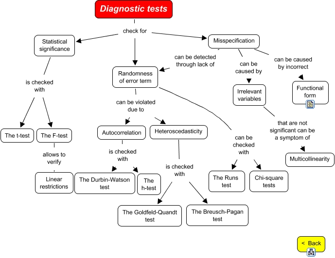 This Concept Map, created with IHMC CmapTools, has information related to: Diagnostic tests, Irrelevant variables that are not significant can be a symptom of Multicollinearity, Randomness of error term can be violated due to Heteroscedasticity, Randomness of error term can be violated due to Autocorrelation, Diagnostic tests check for Randomness of error term, Diagnostic tests check for Misspecification, Autocorrelation is checked with The Durbin-Watson test, Autocorrelation is checked with The h-test, Heteroscedasticity is checked with The Breusch-Pagan test, Misspecification can be detected through lack of Randomness of error term, Statistical significance is checked with The t-test, Statistical significance is checked with The F-test, Heteroscedasticity is checked with The Goldfeld-Quandt test, Diagnostic tests check for Statistical significance, The F-test allows to verify Linear restrictions, Misspecification can be caused by incorrect Functional form, Randomness of error term can be checked with Chi-square tests, Misspecification can be caused by Irrelevant variables, Randomness of error term can be checked with The Runs test