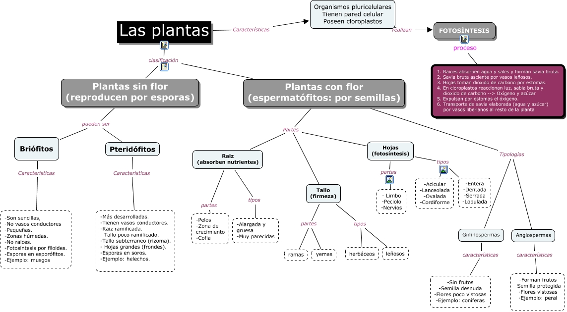 Este Cmap, tiene información relacionada con: Las plantas con enlaces, FOTOSÍNTESIS proceso 1. Raices absorben agua y sales y forman savia bruta. 2. Savia bruta asciente por vasos leñosos. 3. Hojas toman dióxido de carbono por estomas. 4. En cloroplastos reaccionan luz, sabia bruta y dioxido de carbono --> Oxígeno y azúcar 5. Expulsan por estomas el óxigeno. 6. Transporte de savia elaborada (agua y azúcar) por vasos liberianos al resto de la planta, Briófitos Características -Son sencillas, -No vasos conductores -Pequeñas. -Zonas húmedas. -No raices. -Fotosíntesis por filoides. -Esporas en esporófitos. -Ejemplo: musgos, Plantas con flor (espermatófitos: por semillas) Tipologías Gimnospermas, Pteridófitos Características -Más desarrolladas. -Tienen vasos conductores. -Raiz ramificada. - Tallo poco ramificado. -Tallo subterraneo (rizoma). - Hojas grandes (frondes). -Esporas en soros. -Ejemplo: helechos., Plantas con flor (espermatófitos: por semillas) Partes Raiz (absorben nutrientes), Hojas (fotosíntesis) tipos -Entera -Dentada -Serrada -Lobulada, Raiz (absorben nutrientes) partes -Pelos -Zona de crecimiento -Cofia, Plantas con flor (espermatófitos: por semillas) Partes Tallo (firmeza), Hojas (fotosíntesis) tipos -Acicular -Lanceolada -Ovalada -Cordiforme, Las plantas clasificación Plantas con flor (espermatófitos: por semillas), Tallo (firmeza) partes ramas, Las plantas clasificación Plantas sin flor (reproducen por esporas), Tallo (firmeza) tipos leñosos, Plantas con flor (espermatófitos: por semillas) Tipologías Angiospermas, Angiospermas características -Forman frutos -Semilla protegida -Flores vistosas -Ejemplo: peral, Gimnospermas características -Sin frutos -Semilla desnuda -Flores poco vistosas -Ejemplo: coníferas, Plantas sin flor (reproducen por esporas) pueden ser Briófitos, Tallo (firmeza) tipos herbáceos, Organismos pluricelulares Tienen pared celular Poseen cloroplastos realizan FOTOSÍNTESIS, Raiz (absorben nutrientes) tipos -Alargada y gruesa -Muy parecidas