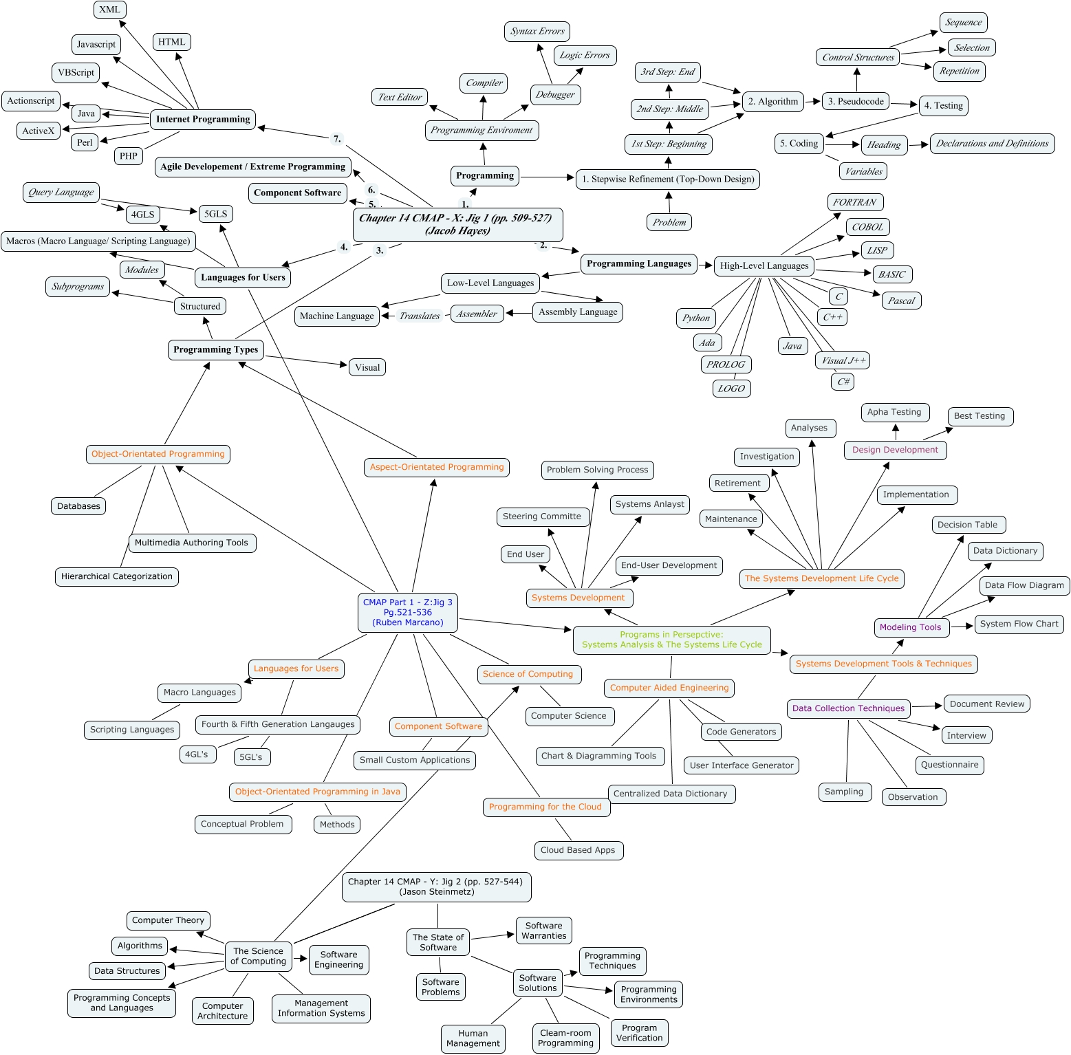 This Concept Map, created with IHMC CmapTools, has information related to: 1, Programs in Persepctive: Systems Analysis & The Systems Life Cycle Systems Development Tools & Techniques, CMAP Part 1 - Z:Jig 3 Pg.521-536 (Ruben Marcano) Component Software, The Science of Computing Data Structures, 5. Coding Variables, High-Level Languages Ada, The Science of Computing Algorithms, Software Solutions Program Verification, 2. Algorithm 3. Pseudocode, The Science of Computing Management Information Systems, Object-Orientated Programming Multimedia Authoring Tools, Programming Enviroment Debugger, Programs in Persepctive: Systems Analysis & The Systems Life Cycle Systems Development, Design Development Apha Testing, Object-Orientated Programming in Java Methods, Problem 1. Stepwise Refinement (Top-Down Design), High-Level Languages FORTRAN, Programming Enviroment Text Editor, Programming Types Structured, Query Language 5GLS, Object-Orientated Programming in Java Conceptual Problem