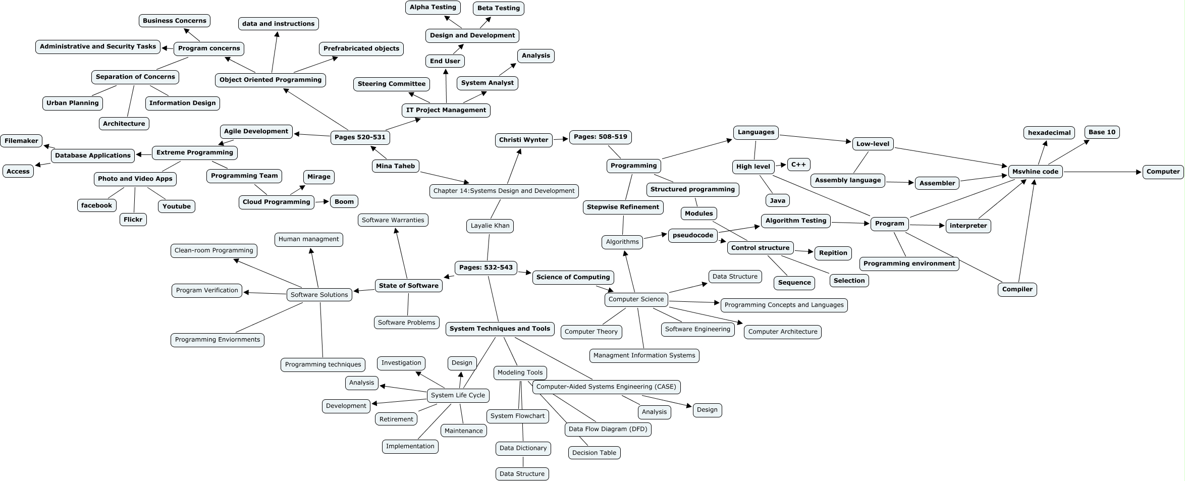 This Concept Map, created with IHMC CmapTools, has information related to: 1, Structured programming Modules, Programming Languages, Chapter 14:Systems Design and Development Layalie Khan, Object Oriented Programming Program concerns, Mina Taheb Chapter 14:Systems Design and Development, Computer Science Algorithms, State of Software Software Warranties, Data Dictionary Data Structure, Program Compiler, IT Project Management System Analyst, Christi Wynter Pages: 508-519, Pages: 532-543 System Techniques and Tools, High level Java, Msvhine code Base 10, Separation of Concerns Information Design, Object Oriented Programming Prefrabricated objects, System Life Cycle Design, Languages Low-level, Modeling Tools Decision Table, Low-level Msvhine code