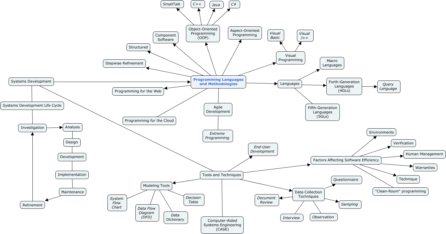This Concept Map, created with IHMC CmapTools, has information related to: 1, Data Collection Techniques Questionnaire, Object-Oriented Programming (OOP) SmallTalk, Systems Development Tools and Techniques, Tools and Techniques Computer-Aided Systems Engineering (CASE), Maintenance Retirement, Tools and Techniques Modeling Tools, Programming Languages and Methodologies Programming for the Web, Modeling Tools Decision Table, Development Implementation, Tools and Techniques Factors Affecting Software Efficiency, Languages Macro Languages, Factors Affecting Software Efficiency Human Management, Factors Affecting Software Efficiency "Clean-Room" programming, Programming Languages and Methodologies Component Software, Languages Fifth-Generation Languages (5GLs), Modeling Tools System Flow Chart, Data Collection Techniques Interview, Factors Affecting Software Efficiency Technique, Visual Programming Visual Basic, Agile Development Extreme Programming