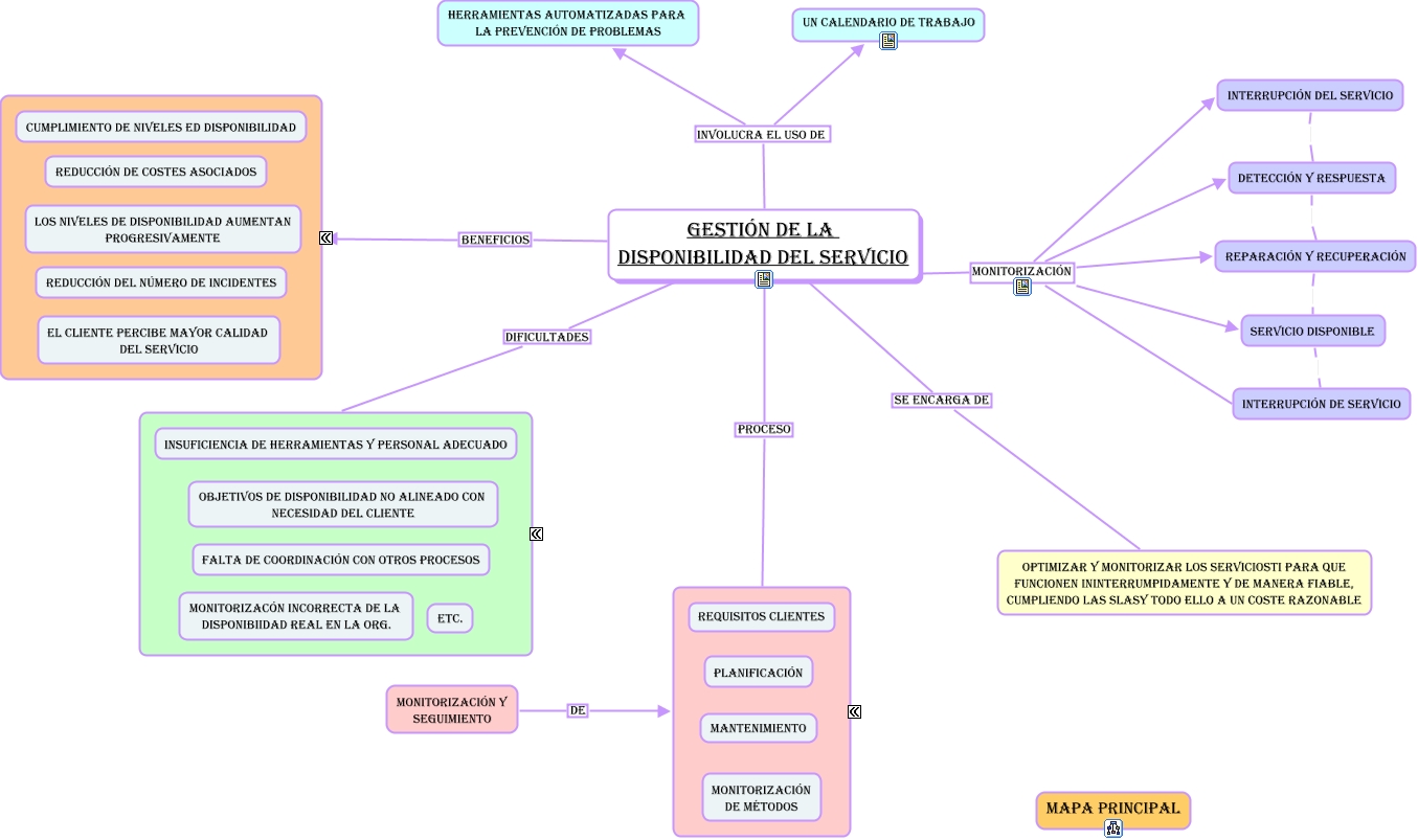 Este Cmap, tiene información relacionada con: Gestión de la Disponibilidad del Servicio, Gestión de la disponibilidad del Servicio se encarga de optimizar y monitorizar los serviciosTI para que funcionen ininterrumpidamente y de manera fiable, cumpliendo las SLAsy todo ello a un coste razonable, Gestión de la disponibilidad del Servicio monitorización servicio disponible, Gestión de la disponibilidad del Servicio beneficios ????, reparación y recuperación servicio disponible, Gestión de la disponibilidad del Servicio monitorización detección y respuesta, interrupción del servicio detección y respuesta, Gestión de la disponibilidad del Servicio proceso ????, Gestión de la disponibilidad del Servicio involucra el uso de herramientas automatizadas para la prevención de problemas, Gestión de la disponibilidad del Servicio involucra el uso de un calendario de trabajo, Monitorización y seguimiento de ????, Gestión de la disponibilidad del Servicio monitorización interrupción de servicio, Gestión de la disponibilidad del Servicio dificultades ????, Gestión de la disponibilidad del Servicio monitorización reparación y recuperación, detección y respuesta reparación y recuperación, Gestión de la disponibilidad del Servicio monitorización interrupción del servicio, servicio disponible interrupción de servicio