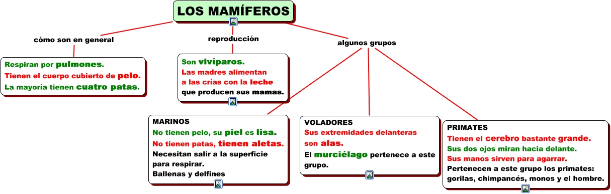 Este Cmap, tiene información relacionada con: LOS MAMÍFEROS, LOS MAMÍFEROS cómo son en general Respiran por pulmones. Tienen el cuerpo cubierto de pelo. La mayoría tienen cuatro patas., LOS MAMÍFEROS reproducción Son vivíparos. Las madres alimentan a las crías con la leche que producen sus mamas., LOS MAMÍFEROS algunos grupos PRIMATES Tienen el cerebro bastante grande. Sus dos ojos miran hacia delante. Sus manos sirven para agarrar. Pertenecen a este grupo los primates: gorilas, chimpancés, monos y el hombre., LOS MAMÍFEROS algunos grupos MARINOS No tienen pelo, su piel es lisa. No tienen patas, tienen aletas. Necesitan salir a la superficie para respirar. Ballenas y delfines, LOS MAMÍFEROS algunos grupos VOLADORES Sus extremidades delanteras son alas. El murciélago pertenece a este grupo.