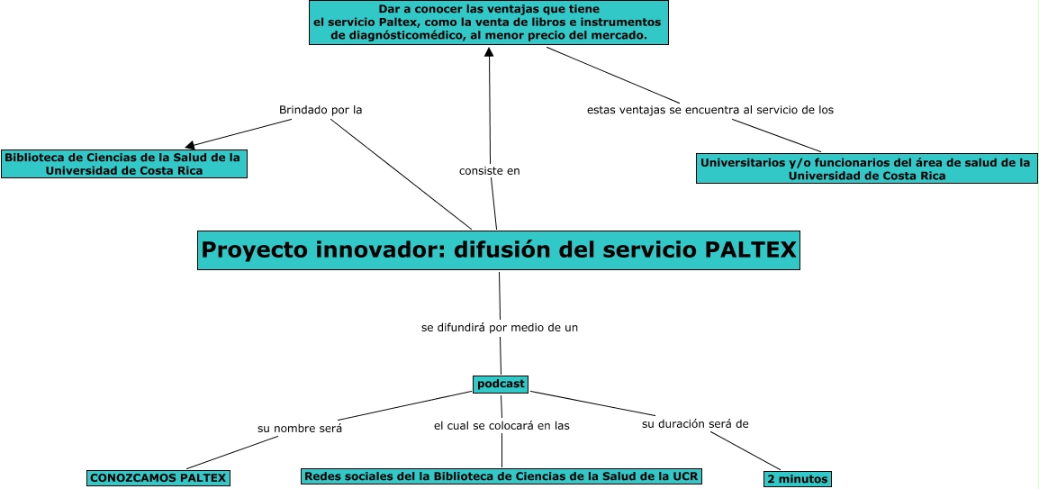 Este Cmap, tiene información relacionada con: Proyecto innovador de Katherine, Andrea y Joyce, podcast el cual se colocará en las Redes sociales del la Biblioteca de Ciencias de la Salud de la UCR, Proyecto innovador: difusión del servicio PALTEX consiste en Dar a conocer las ventajas que tiene el servicio Paltex, como la venta de libros e instrumentos de diagnósticomédico, al menor precio del mercado., podcast su duración será de 2 minutos, Proyecto innovador: difusión del servicio PALTEX se difundirá por medio de un podcast, Proyecto innovador: difusión del servicio PALTEX Brindado por la Biblioteca de Ciencias de la Salud de la Universidad de Costa Rica, Dar a conocer las ventajas que tiene el servicio Paltex, como la venta de libros e instrumentos de diagnósticomédico, al menor precio del mercado. estas ventajas se encuentra al servicio de los Universitarios y/o funcionarios del área de salud de la Universidad de Costa Rica, podcast su nombre será CONOZCAMOS PALTEX