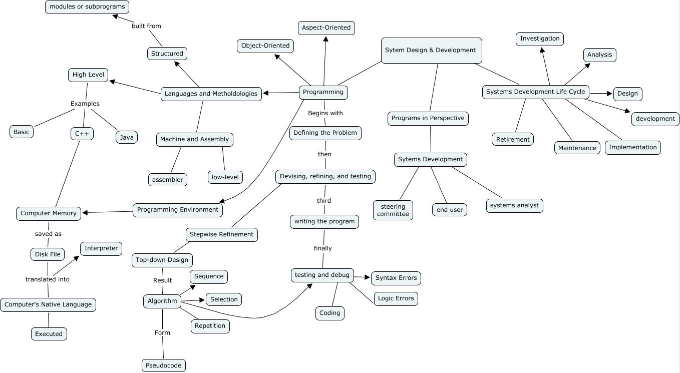 This Concept Map, created with IHMC CmapTools, has information related to: Team 4, Systems Development Life Cycle ???? Maintenance, Languages and Metholdologies ???? High Level, Systems Development Life Cycle ???? Implementation, testing and debug ???? Coding, Structured built from modules or subprograms, Devising, refining, and testing ???? Stepwise Refinement, High Level Examples Basic, Programming ???? Aspect-Oriented, Sytem Design & Development ???? Programming, Programming ???? Languages and Metholdologies, Programs in Perspective ???? Sytems Development, Programming ???? Programming Environment, Machine and Assembly ???? low-level, Systems Development Life Cycle ???? Investigation, Disk File translated into Interpreter, Algorithm ???? Repetition, Languages and Metholdologies ???? Machine and Assembly, Computer's Native Language ???? Executed, Algorithm ???? Selection, Sytems Development ???? systems analyst