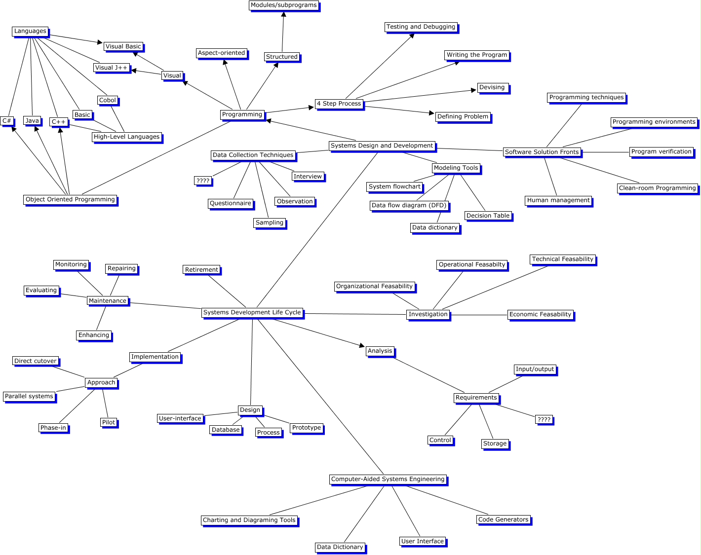 This Concept Map, created with IHMC CmapTools, has information related to: 1, Systems Development Life Cycle Design, Systems Development Life Cycle Investigation, Object Oriented Programming C#, Maintenance Enhancing, Requirements Input/output, Systems Development Life Cycle Analysis, 4 Step Process Defining Problem, Implementation Approach, Software Solution Fronts Clean-room Programming, Languages Cobol, Object Oriented Programming C++, Requirements ????, Investigation Organizational Feasability, Investigation Technical Feasability, Approach Phase-in, Systems Design and Development Data Collection Techniques, Systems Design and Development Systems Development Life Cycle, Languages C#, Programming 4 Step Process, Programming Visual
