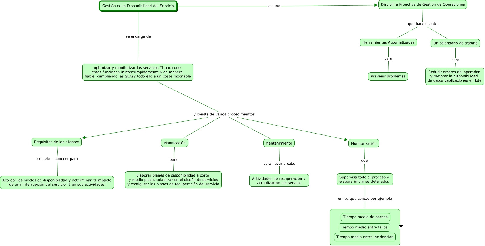 Este Cmap, tiene información relacionada con: Gestión de la Disponibilidad del Servicio, Requisitos de los clientes se deben conocer para Acordar los niveles de disponibilidad y determinar el impacto de una interrupción del servicio TI en sus actividades, optimizar y monitorizar los servicios TI para que estos funcionen ininterrumpidamente y de manera fiable, cumpliendo las SLAsy todo ello a un coste razonable y consta de varios procedimientos Monitorización, optimizar y monitorizar los servicios TI para que estos funcionen ininterrumpidamente y de manera fiable, cumpliendo las SLAsy todo ello a un coste razonable y consta de varios procedimientos Requisitos de los clientes, Disciplina Proactiva de Gestión de Operaciones que hace uso de Herramientas Automatizadas, Planificación para Elaborar planes de disponibilidad a corto y medio plazo, colaborar en el diseño de servicios y configurar los planes de recuperación del servicio, Gestión de la Disponibilidad del Servicio es una Disciplina Proactiva de Gestión de Operaciones, Monitorización que Supervisa todo el proceso y elabora informes detallados, Un calendario de trabajo para Reducir errores del operador y mejorar la disponibilidad de datos yaplicaciones en lote, Supervisa todo el proceso y elabora informes detallados en los que conste por ejemplo ????, optimizar y monitorizar los servicios TI para que estos funcionen ininterrumpidamente y de manera fiable, cumpliendo las SLAsy todo ello a un coste razonable y consta de varios procedimientos Mantenimiento, Gestión de la Disponibilidad del Servicio se encarga de optimizar y monitorizar los servicios TI para que estos funcionen ininterrumpidamente y de manera fiable, cumpliendo las SLAsy todo ello a un coste razonable, Mantenimiento para llevar a cabo Actividades de recuperación y actualización del servicio, optimizar y monitorizar los servicios TI para que estos funcionen ininterrumpidamente y de manera fiable, cumpliendo las SLAsy todo ello a un coste razonable y consta de varios procedimientos Planificación, Herramientas Automatizadas para Prevenir problemas, Disciplina Proactiva de Gestión de Operaciones que hace uso de Un calendario de trabajo