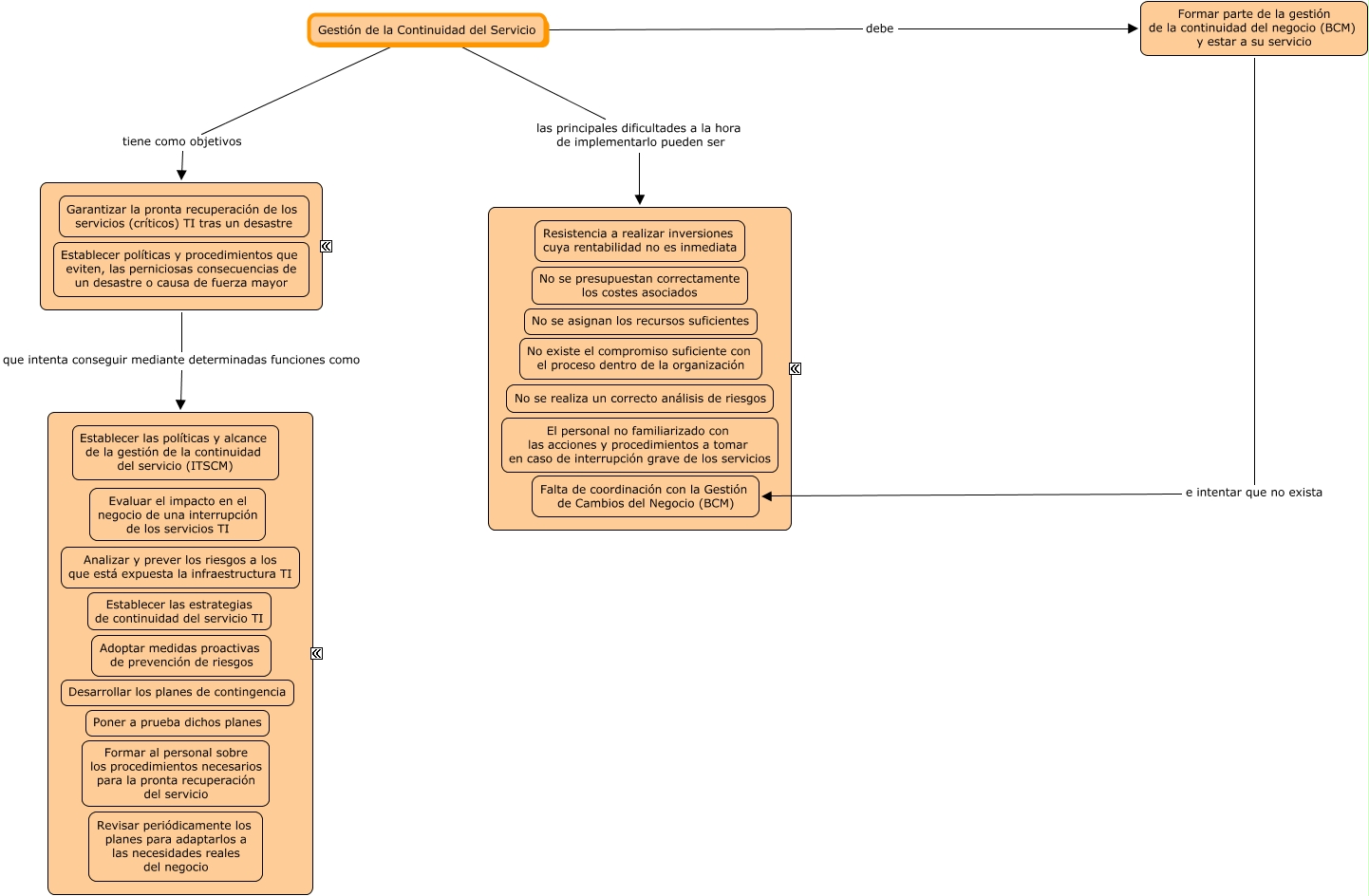 Este Cmap, tiene información relacionada con: Gestión de la Continuidad del Servicio, Formar parte de la gestión de la continuidad del negocio (BCM) y estar a su servicio e intentar que no exista Falta de coordinación con la Gestión de Cambios del Negocio (BCM), Gestión de la Continuidad del Servicio debe Formar parte de la gestión de la continuidad del negocio (BCM) y estar a su servicio, Gestión de la Continuidad del Servicio las principales dificultades a la hora de implementarlo pueden ser ????, ???? que intenta conseguir mediante determinadas funciones como ????, Gestión de la Continuidad del Servicio tiene como objetivos ????