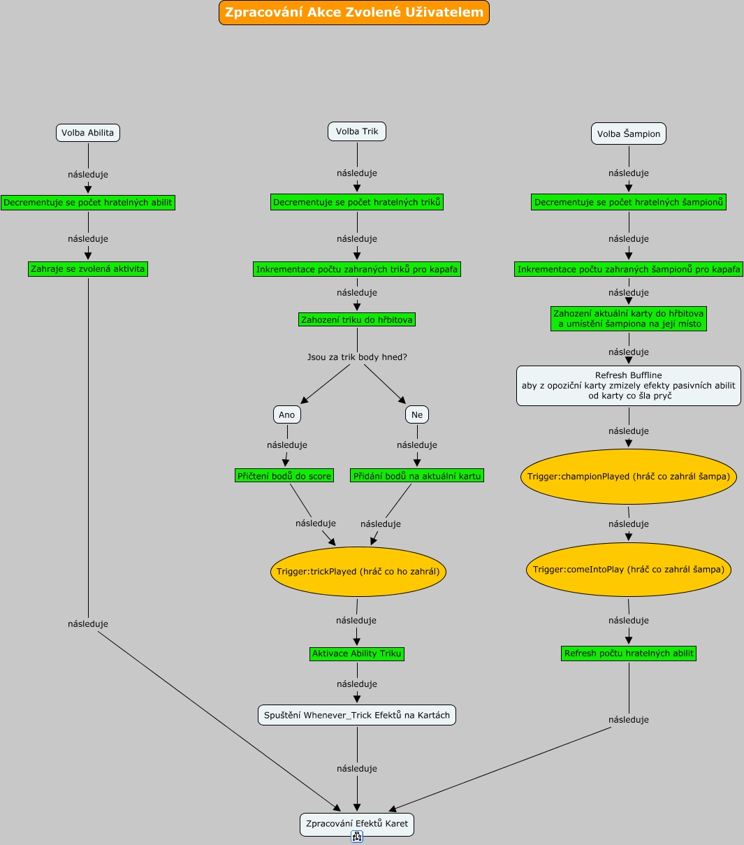 Tato Cmapa, vytvořená pomocí CmapTools, obsahuje informaci související s: Zpracovani Zvolene Akce, Ano následuje Přičtení bodů do score, Zahození aktuální karty do hřbitova a umístění šampiona na její místo následuje Refresh Buffline aby z opoziční karty zmizely efekty pasivních abilit od karty co šla pryč, Volba Šampion následuje Decrementuje se počet hratelných šampionů, Přidání bodů na aktuální kartu následuje Trigger:trickPlayed (hráč co ho zahrál), Refresh počtu hratelných abilit následuje Zpracování Efektů Karet, Inkrementace počtu zahraných triků pro kapafa následuje Zahození triku do hřbitova, Volba Trik následuje Decrementuje se počet hratelných triků, Zahození triku do hřbitova Jsou za trik body hned? Ne, Trigger:trickPlayed (hráč co ho zahrál) následuje Aktivace Ability Triku, Přičtení bodů do score následuje Trigger:trickPlayed (hráč co ho zahrál), Zahození triku do hřbitova Jsou za trik body hned? Ano, Trigger:comeIntoPlay (hráč co zahrál šampa) následuje Refresh počtu hratelných abilit, Volba Abilita následuje Decrementuje se počet hratelných abilit, Aktivace Ability Triku následuje Spuštění Whenever_Trick Efektů na Kartách, Decrementuje se počet hratelných triků následuje Inkrementace počtu zahraných triků pro kapafa, Spuštění Whenever_Trick Efektů na Kartách následuje Zpracování Efektů Karet, Zahraje se zvolená aktivita následuje Zpracování Efektů Karet, Ne následuje Přidání bodů na aktuální kartu, Decrementuje se počet hratelných šampionů následuje Inkrementace počtu zahraných šampionů pro kapafa, Refresh Buffline aby z opoziční karty zmizely efekty pasivních abilit od karty co šla pryč následuje Trigger:championPlayed (hráč co zahrál šampa)
