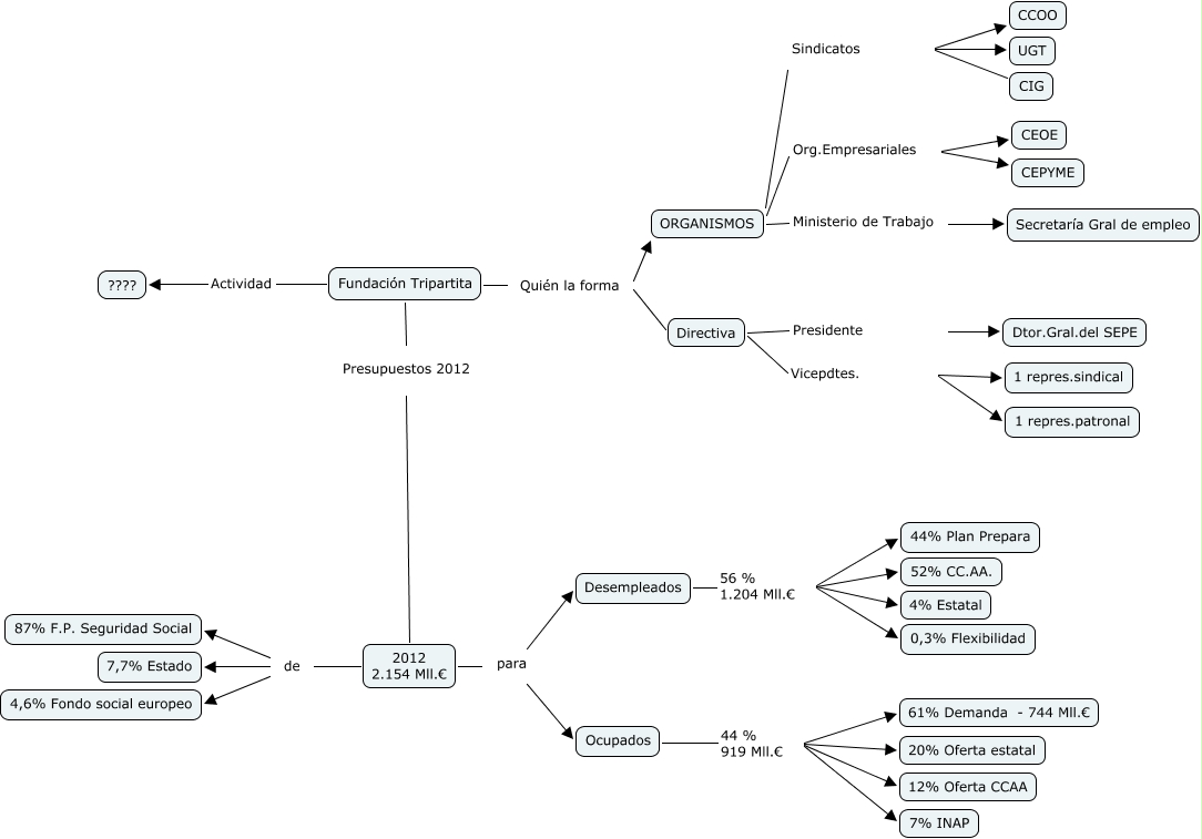 Este Cmap, tiene información relacionada con: Cursos-12-Estudio de mercado-FundTripartita, Ocupados 44 % 919 Mll.€ 61% Demanda - 744 Mll.€, Fundación Tripartita Presupuestos 2012 2012 2.154 Mll.€, 2012 2.154 Mll.€ de 87% F.P. Seguridad Social, Desempleados 56 % 1.204 Mll.€ 44% Plan Prepara, Ocupados 44 % 919 Mll.€ 7% INAP, ORGANISMOS Org.Empresariales CEOE, 2012 2.154 Mll.€ de 7,7% Estado, Ocupados 44 % 919 Mll.€ 12% Oferta CCAA, Fundación Tripartita Quién la forma Directiva, Directiva Vicepdtes. 1 repres.sindical, ORGANISMOS Sindicatos CCOO, ORGANISMOS Org.Empresariales CEPYME, Ocupados 44 % 919 Mll.€ 20% Oferta estatal, Desempleados 56 % 1.204 Mll.€ 52% CC.AA., 2012 2.154 Mll.€ para Ocupados, 2012 2.154 Mll.€ para Desempleados, 2012 2.154 Mll.€ de 4,6% Fondo social europeo, Directiva Vicepdtes. 1 repres.patronal, ORGANISMOS Sindicatos UGT, Desempleados 56 % 1.204 Mll.€ 0,3% Flexibilidad