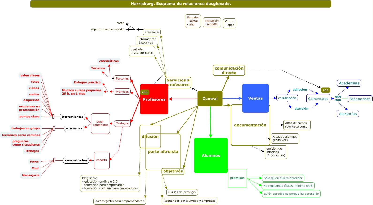 Este Cmap, tiene información relacionada con: Cursos-22-Esquema de relaciones-desglosado, Comerciales que son Asociaciones, Trabajos crear contenidos examenes, herramientas esquemas en presentación, Central documentación Altas de alumnos (cada vez), comunicación Mensajería, comunicación Foros, examenes preguntas como situaciones, Central Servicios a profesores enseñar a, Central Servicios a profesores controlar 1 vez por curso, herramientas video clases, premisas Sólo quien quiera aprender, Central objetivos Cursos de prestigio, Central comunicación directa con, coordinación atención Comerciales, Trabajos crear contenidos herramientas, examenes Trabajos, Central Ventas coordinación, herramientas esquemas, enseñar a crear, Central comunicación directa con