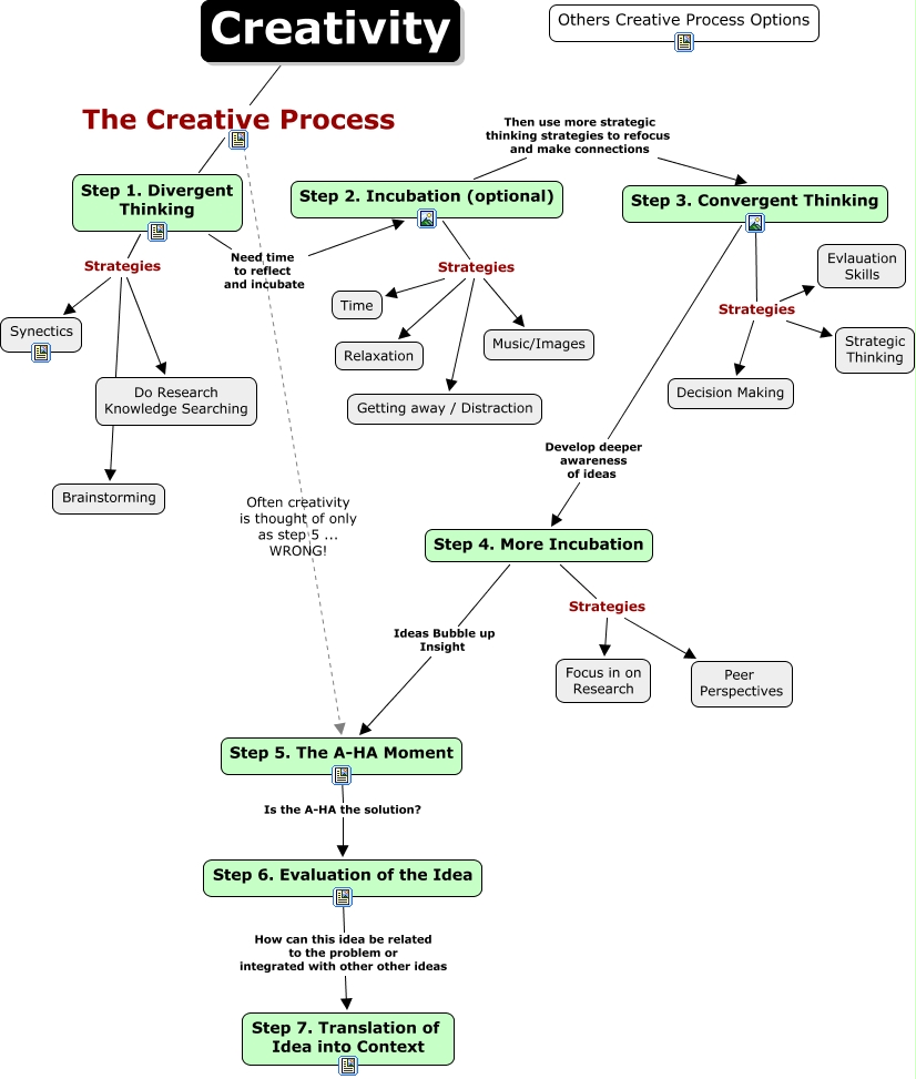 This Concept Map, created with IHMC CmapTools, has information related to: The Creative Process CMAP_rev, Step 3. Convergent Thinking Strategies Strategic Thinking, Step 2. Incubation (optional) Then use more strategic thinking strategies to refocus and make connections Step 3. Convergent Thinking, Step 1. Divergent Thinking Need time to reflect and incubate Step 2. Incubation (optional), Step 2. Incubation (optional) Strategies Getting away / Distraction, Step 3. Convergent Thinking Strategies Evlauation Skills, Step 3. Convergent Thinking Develop deeper awareness of ideas Step 4. More Incubation, Step 2. Incubation (optional) Strategies Music/Images, Step 5. The A-HA Moment Is the A-HA the solution? Step 6. Evaluation of the Idea, Step 6. Evaluation of the Idea How can this idea be related to the problem or integrated with other other ideas Step 7. Translation of Idea into Context, Creativity The Creative Process Step 1. Divergent Thinking, Step 1. Divergent Thinking Strategies Do Research Knowledge Searching, Step 4. More Incubation Strategies Peer Perspectives, Step 4. More Incubation Strategies Focus in on Research, Step 2. Incubation (optional) Strategies Time, Creativity The Creative Process Step 5. The A-HA Moment, Step 1. Divergent Thinking Strategies Brainstorming, Step 3. Convergent Thinking Strategies Decision Making, Step 4. More Incubation Ideas Bubble up Insight Step 5. The A-HA Moment, Step 1. Divergent Thinking Strategies Synectics, Step 2. Incubation (optional) Strategies Relaxation