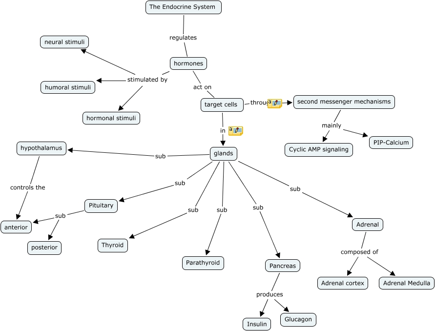 This Concept Map, created with IHMC CmapTools, has information related to: Endocrine System (Group 2), hormones stimulated by hormonal stimuli, Pancreas produces Glucagon, Adrenal composed of Adrenal cortex, The Endocrine System regulates hormones, Pituitary sub posterior, second messenger mechanisms mainly PIP-Calcium, glands sub Parathyroid, target cells in glands, hormones stimulated by humoral stimuli, glands sub Adrenal, glands sub Thyroid, second messenger mechanisms mainly Cyclic AMP signaling, Adrenal composed of Adrenal Medulla, hormones act on target cells, target cells through second messenger mechanisms, glands sub hypothalamus, hypothalamus controls the anterior, Pituitary sub anterior, hormones stimulated by neural stimuli, Pancreas produces Insulin