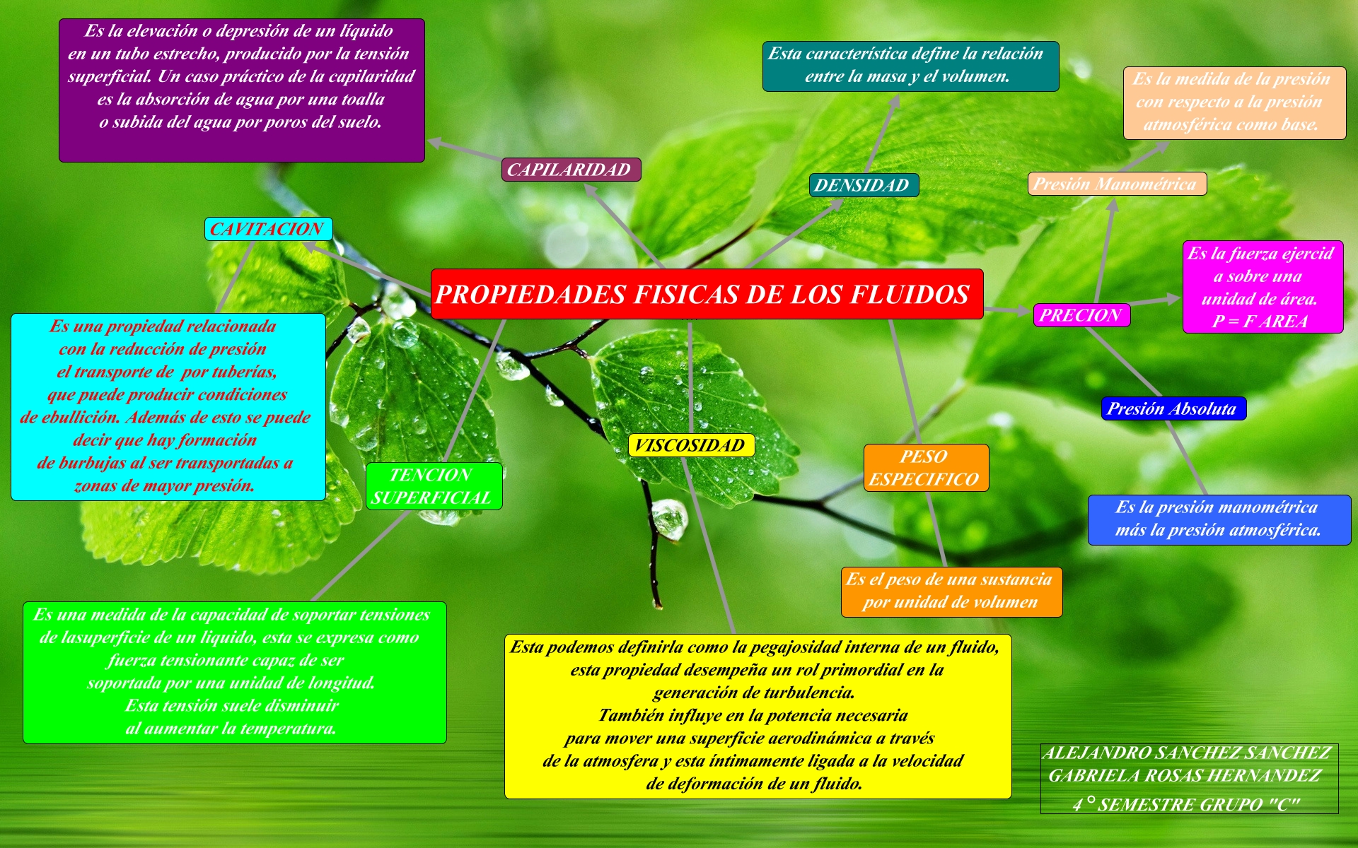 Este Cmap, tiene información relacionada con: fluidos-alejandro sanchez y gabriela rosas, PROPIEDADES FISICAS DE LOS FLUIDOS ???? VISCOSIDAD, PRECION ???? Es la fuerza ejercid a sobre una unidad de área. P = F AREA, PROPIEDADES FISICAS DE LOS FLUIDOS ???? CAPILARIDAD, PROPIEDADES FISICAS DE LOS FLUIDOS ???? DENSIDAD, Presión Absoluta ???? Es la presión manométrica más la presión atmosférica., CAPILARIDAD ???? Es la elevación o depresión de un líquido en un tubo estrecho, producido por la tensión superficial. Un caso práctico de la capilaridad es la absorción de agua por una toalla o subida del agua por poros del suelo., PESO ESPECIFICO ???? Es el peso de una sustancia por unidad de volumen, PROPIEDADES FISICAS DE LOS FLUIDOS ???? CAVITACION, PROPIEDADES FISICAS DE LOS FLUIDOS ???? PRECION, DENSIDAD ???? Esta característica define la relación entre la masa y el volumen., TENCION SUPERFICIAL ???? Es una medida de la capacidad de soportar tensiones de lasuperficie de un liquido, esta se expresa como fuerza tensionante capaz de ser soportada por una unidad de longitud. Esta tensión suele disminuir al aumentar la temperatura., PRECION ???? Presión Absoluta, VISCOSIDAD ???? Esta podemos definirla como la pegajosidad interna de un fluido, esta propiedad desempeña un rol primordial en la generación de turbulencia. También influye en la potencia necesaria para mover una superficie aerodinámica a través de la atmosfera y esta íntimamente ligada a la velocidad de deformación de un fluido., Presión Manométrica ???? Es la medida de la presión con respecto a la presión atmosférica como base., PROPIEDADES FISICAS DE LOS FLUIDOS ???? TENCION SUPERFICIAL, PRECION ???? Presión Manométrica, PROPIEDADES FISICAS DE LOS FLUIDOS ???? PESO ESPECIFICO, CAVITACION ???? Es una propiedad relacionada con la reducción de presión el transporte de por tuberías, que puede producir condiciones de ebullición. Además de esto se puede decir que hay formación de burbujas al ser transportadas a zonas de mayor presión.