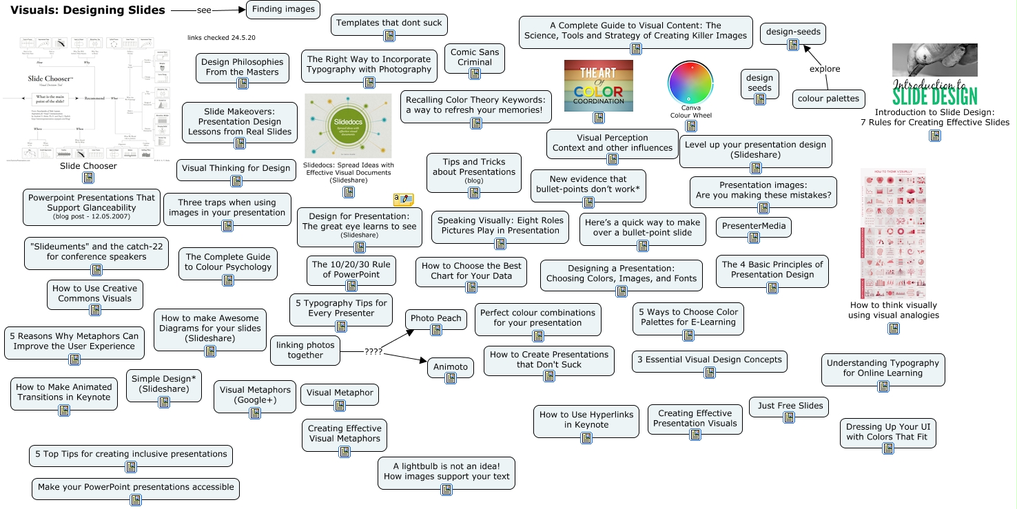 This Concept Map, created with IHMC CmapTools, has information related to: Visuals - Designing Slides, colour palettes explore design-seeds, Visuals: Designing Slides see Finding images, linking photos together ???? Animoto, linking photos together ???? Photo Peach
