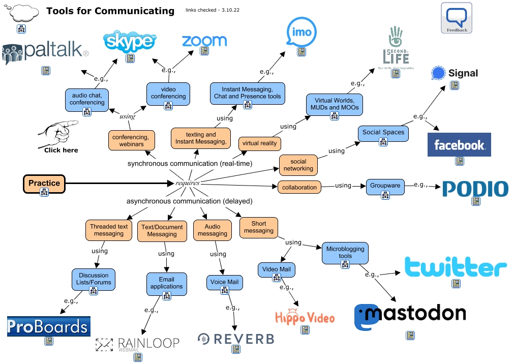 This Concept Map, created with IHMC CmapTools, has information related to: communicating, Short messaging using Microblogging tools, Microblogging tools e.g.,, Practice requires virtual reality, Voice Mail e.g.,, Practice requires texting and Instant Messaging,, Video Mail e.g.,, Virtual Worlds, MUDs and MOOs e.g.,, Instant Messaging, Chat and Presence tools e.g.,, Practice requires Short messaging, conferencing, webinars using video conferencing, Practice requires collaboration, social networking using Social Spaces, video conferencing e.g.,, Threaded text messaging using Discussion Lists/Forums, Practice requires Audio messaging, Microblogging tools e.g.,, Discussion Lists/Forums e.g.,, collaboration using Groupware, Practice requires Text/Document Messaging, Text/Document Messaging using Email applications
