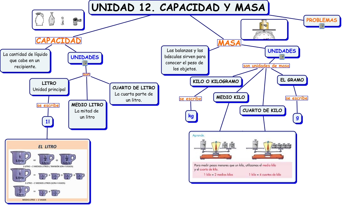 Este Cmap, tiene información relacionada con: UNIDAD 12. CAPACIDAD Y MASA, MEDIO KILO ????, 1l ????, UNIDAD 12. CAPACIDAD Y MASA CAPACIDAD La cantidad de líquido que cabe en un recipiente., UNIDADES son MEDIO LITRO La mitad de un litro, UNIDADES son unidades de masa KILO O KILOGRAMO, UNIDAD 12. CAPACIDAD Y MASA MASA Las balanzas y las básculas sirven para conocer el peso de los objetos., UNIDADES son unidades de masa MEDIO KILO, UNIDADES son unidades de masa EL GRAMO, UNIDADES son unidades de masa CUARTO DE KILO, UNIDADES son LITRO Unidad principal, LITRO Unidad principal se escribe 1l, UNIDAD 12. CAPACIDAD Y MASA MASA UNIDADES, EL GRAMO se escribe g, UNIDAD 12. CAPACIDAD Y MASA ???? PROBLEMAS, UNIDADES son CUARTO DE LITRO La cuarta parte de un litro., KILO O KILOGRAMO se escribe kg, UNIDAD 12. CAPACIDAD Y MASA CAPACIDAD UNIDADES, CUARTO DE KILO ????