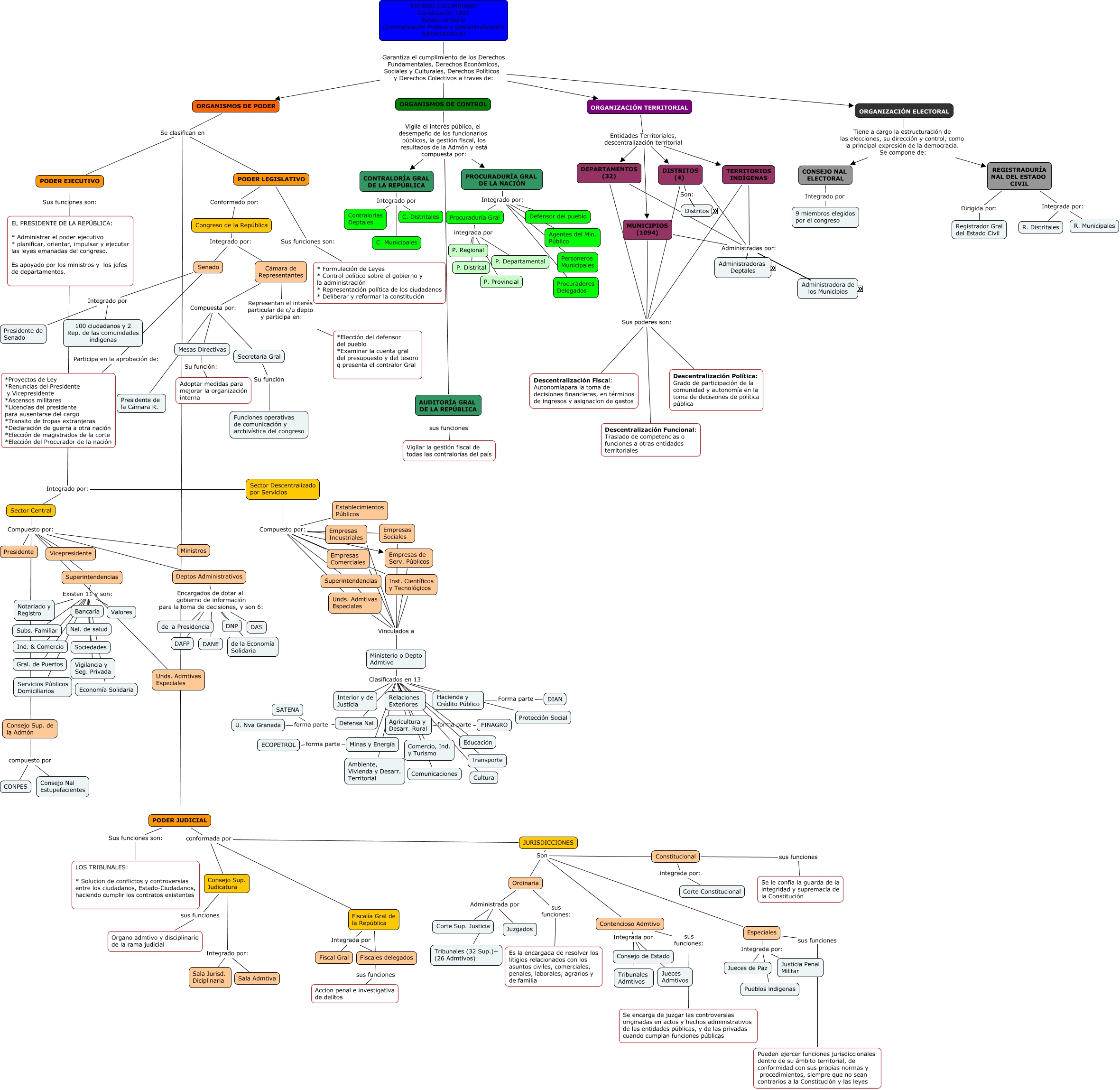 Este Cmap, tiene información relacionada con: ESTRUCTURA DEL ESTADO COLOMBIANO, ORGANIZACIÓN ELECTORAL Tiene a cargo la estructuración de las elecciones, su dirección y control, como la principal expresión de la democracia. Se compone de: REGISTRADURÍA NAL DEL ESTADO CIVIL, ORGANIZACIÓN ELECTORAL Tiene a cargo la estructuración de las elecciones, su dirección y control, como la principal expresión de la democracia. Se compone de: CONSEJO NAL ELECTORAL, DISTRITOS (4) Son: Santa Martha, Ministerio o Depto Admtivo Clasificados en 13: Agricultura y Desarr. Rural, Constitucional integrada por: Corte Constitucional, Mesas Directivas Su función: Adoptar medidas para mejorar la organización interna, Asamblea Deptal Administradas por: Junta Admdora Local, Minas y Energía forma parte ECOPETROL, Superintendencias Existen 11 y son: Valores, Deptos Administrativos Encargados de dotar al gobierno de información para la toma de decisiones, y son 6: DNP, Asamblea Deptal Administradas por: Consejo Municipal, Agricultura y Desarr. Rural forma parte FINAGRO, Deptos Administrativos Encargados de dotar al gobierno de información para la toma de decisiones, y son 6: de la Presidencia, Constitucional sus funciones Se le confía la guarda de la integridad y supremacía de la Constitución, Sector Central Compuesto por: Deptos Administrativos, Deptos Administrativos Encargados de dotar al gobierno de información para la toma de decisiones, y son 6: DANE, Ministerio o Depto Admtivo Clasificados en 13: Transporte, ORGANISMOS DE PODER Se clasifican en PODER JUDICIAL, Superintendencias Existen 11 y son: Subs. Familiar, JURISDICCIONES Son Constitucional