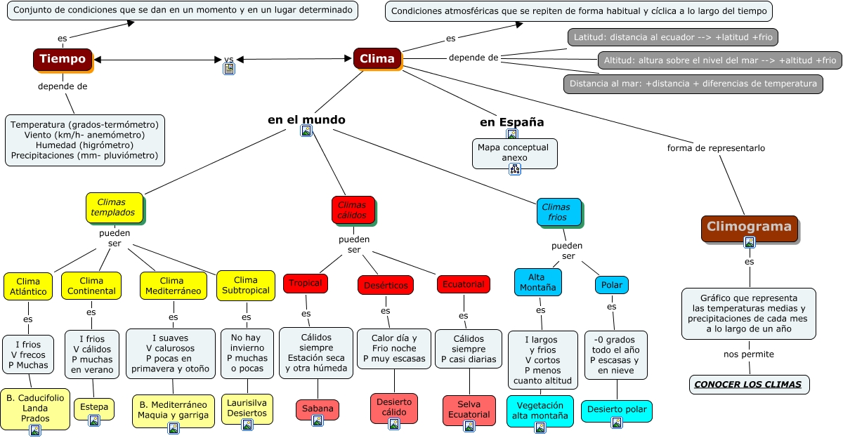 Este Cmap, tiene información relacionada con: Tema 10- Clima y paisaje, Climas templados pueden ser Clima Atlántico, Clima depende de Latitud: distancia al ecuador --> +latitud +frio, Clima Atlántico es I frios V frecos P Muchas, I frios V cálidos P muchas en verano paisajes Estepa, Clima forma de representarlo Climograma, Climas frios pueden ser Alta Montaña, Clima Mediterráneo es I suaves V calurosos P pocas en primavera y otoño, Tiempo depende de Temperatura (grados-termómetro) Viento (km/h- anemómetro) Humedad (higrómetro) Precipitaciones (mm- pluviómetro), Desérticos es Calor día y Frio noche P muy escasas, I suaves V calurosos P pocas en primavera y otoño ???? B. Mediterráneo Maquia y garriga, Clima Continental es I frios V cálidos P muchas en verano, Tiempo es Conjunto de condiciones que se dan en un momento y en un lugar determinado, Polar es -0 grados todo el año P escasas y en nieve, Clima en España Mapa conceptual anexo, Cálidos siempre P casi diarias ???? Selva Ecuatorial, I frios V frecos P Muchas paisajes B. Caducifolio Landa Prados, Tropical es Cálidos siempre Estación seca y otra húmeda, Climas frios pueden ser Polar, Tiempo vs Clima, Cálidos siempre Estación seca y otra húmeda ???? Sabana