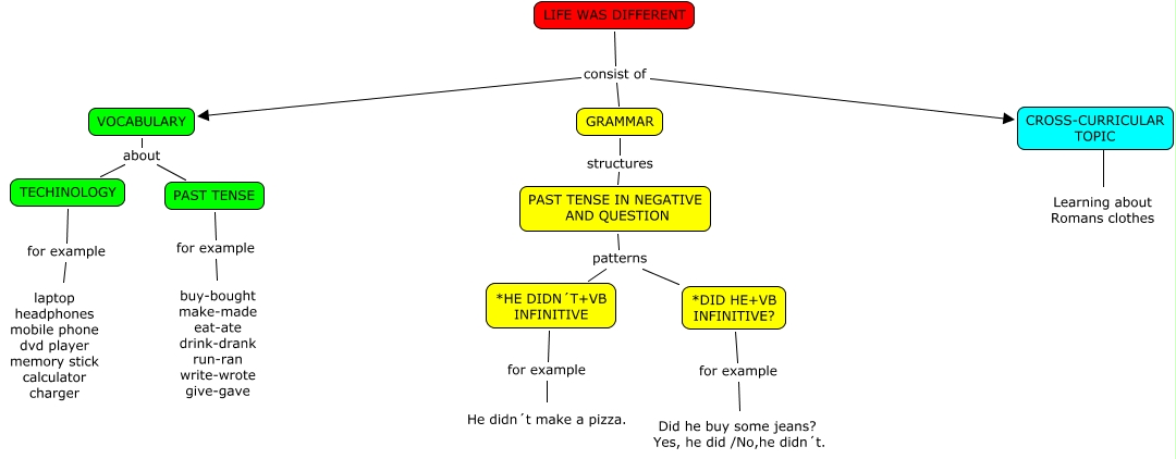 Este Cmap, tiene información relacionada con: LIFE WAS DIFFERENT-Sofía, TECHINOLOGY for example laptop headphones mobile phone dvd player memory stick calculator charger, LIFE WAS DIFFERENT consist of CROSS-CURRICULAR TOPIC, *DID HE+VB INFINITIVE? for example Did he buy some jeans? Yes, he did /No,he didn´t., *DID HE+VB INFINITIVE? for example Did he buy some jeans? Yes, he did /No,he didn´t., LIFE WAS DIFFERENT consist of GRAMMAR, LIFE WAS DIFFERENT consist of VOCABULARY, VOCABULARY about PAST TENSE, PAST TENSE for example buy-bought make-made eat-ate drink-drank run-ran write-wrote give-gave, *HE DIDN´T+VB INFINITIVE for example He didn´t make a pizza., GRAMMAR structures PAST TENSE IN NEGATIVE AND QUESTION, CROSS-CURRICULAR TOPIC ???? Learning about Romans clothes, PAST TENSE IN NEGATIVE AND QUESTION patterns *HE DIDN´T+VB INFINITIVE, PAST TENSE IN NEGATIVE AND QUESTION patterns *DID HE+VB INFINITIVE?, VOCABULARY about TECHINOLOGY, *HE DIDN´T+VB INFINITIVE for example He didn´t make a pizza.