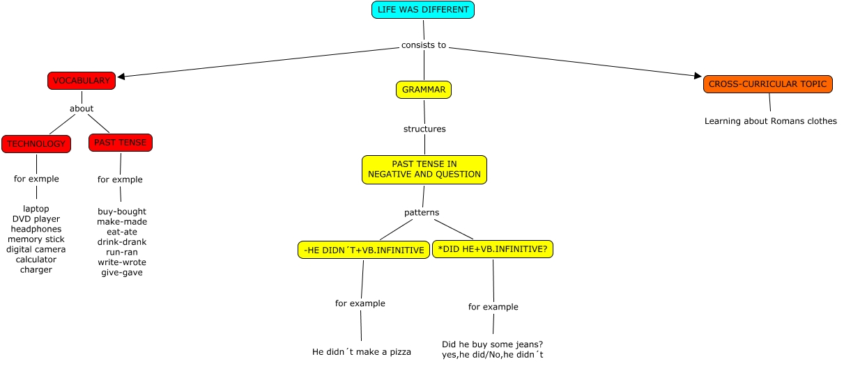 Este Cmap, tiene información relacionada con: LIFE WAS DIFFERENT -Francisco, VOCABULARY about TECHNOLOGY, TECHNOLOGY for exmple laptop DVD player headphones memory stick digital camera calculator charger, LIFE WAS DIFFERENT consists to VOCABULARY, -HE DIDN´T+VB.INFINITIVE for example He didn´t make a pizza, PAST TENSE for exmple buy-bought make-made eat-ate drink-drank run-ran write-wrote give-gave, *DID HE+VB.INFINITIVE? for example Did he buy some jeans? yes,he did/No,he didn´t, VOCABULARY about PAST TENSE, PAST TENSE IN NEGATIVE AND QUESTION patterns -HE DIDN´T+VB.INFINITIVE, GRAMMAR structures PAST TENSE IN NEGATIVE AND QUESTION, CROSS-CURRICULAR TOPIC ???? Learning about Romans clothes, PAST TENSE IN NEGATIVE AND QUESTION patterns *DID HE+VB.INFINITIVE?, LIFE WAS DIFFERENT consists to CROSS-CURRICULAR TOPIC, LIFE WAS DIFFERENT consists to GRAMMAR