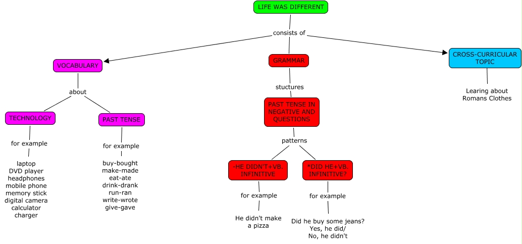 Este Cmap, tiene información relacionada con: LIFE WAS DIFFERENT-Ángel, *DID HE+VB. INFINITIVE? for example Did he buy some jeans? Yes, he did/ No, he didn't, VOCABULARY about PAST TENSE, TECHNOLOGY for example laptop DVD player headphones mobile phone memory stick digital camera calculator charger, VOCABULARY about TECHNOLOGY, LIFE WAS DIFFERENT consists of VOCABULARY, LIFE WAS DIFFERENT consists of GRAMMAR, LIFE WAS DIFFERENT consists of CROSS-CURRICULAR TOPIC, -HE DIDN'T+VB. INFINITIVE for example He didn't make a pizza, GRAMMAR stuctures PAST TENSE IN NEGATIVE AND QUESTIONS, CROSS-CURRICULAR TOPIC ???? Learing about Romans Clothes, PAST TENSE IN NEGATIVE AND QUESTIONS patterns *DID HE+VB. INFINITIVE?, PAST TENSE for example buy-bought make-made eat-ate drink-drank run-ran write-wrote give-gave, PAST TENSE IN NEGATIVE AND QUESTIONS patterns -HE DIDN'T+VB. INFINITIVE