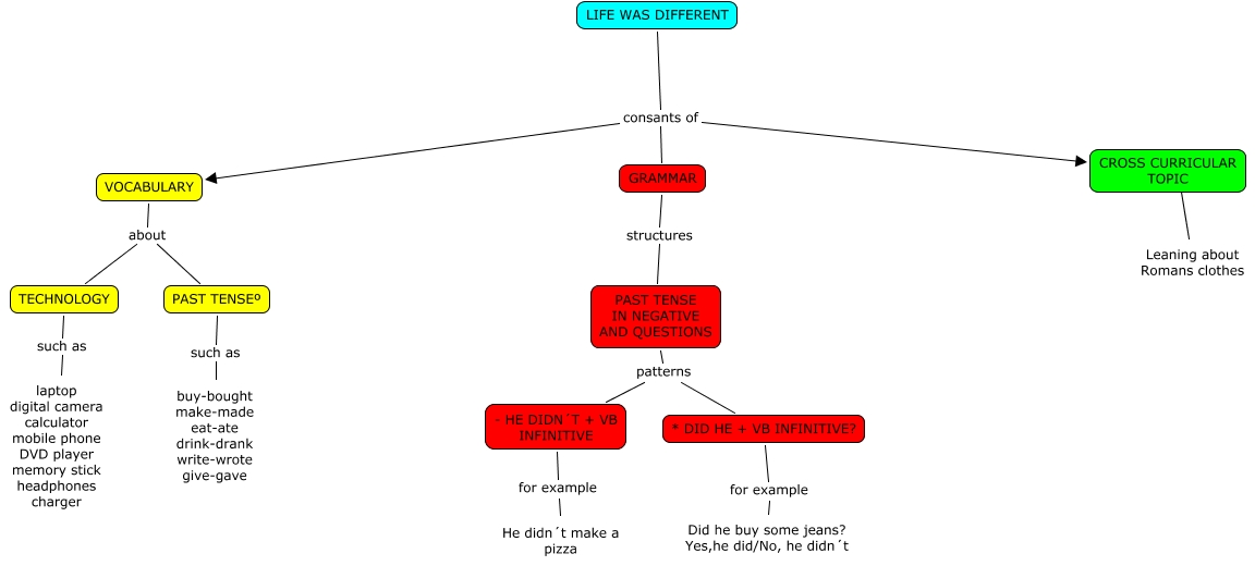 Este Cmap, tiene información relacionada con: LIFE WAS DIFFERENT-Carlos, LIFE WAS DIFFERENT consants of CROSS CURRICULAR TOPIC, LIFE WAS DIFFERENT consants of GRAMMAR, PAST TENSE IN NEGATIVE AND QUESTIONS patterns - HE DIDN´T + VB INFINITIVE, PAST TENSE IN NEGATIVE AND QUESTIONS patterns * DID HE + VB INFINITIVE?, TECHNOLOGY such as laptop digital camera calculator mobile phone DVD player memory stick headphones charger, VOCABULARY about TECHNOLOGY, - HE DIDN´T + VB INFINITIVE for example He didn´t make a pizza, GRAMMAR structures PAST TENSE IN NEGATIVE AND QUESTIONS, LIFE WAS DIFFERENT consants of VOCABULARY, PAST TENSEº such as buy-bought make-made eat-ate drink-drank write-wrote give-gave, CROSS CURRICULAR TOPIC ???? Leaning about Romans clothes, VOCABULARY about PAST TENSEº, * DID HE + VB INFINITIVE? for example Did he buy some jeans? Yes,he did/No, he didn´t