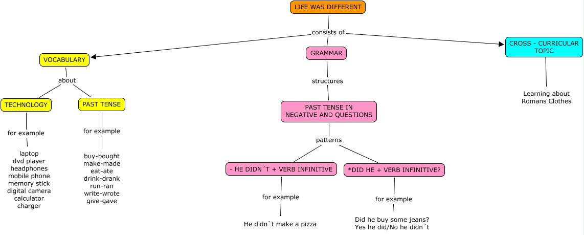 Este Cmap, tiene información relacionada con: LIFE WAS DIFFERENT -Noa, TECHNOLOGY for example laptop dvd player headphones mobile phone memory stick digital camera calculator charger, - HE DIDN´T + VERB INFINITIVE for example He didn`t make a pizza, GRAMMAR structures PAST TENSE IN NEGATIVE AND QUESTIONS, PAST TENSE IN NEGATIVE AND QUESTIONS patterns *DID HE + VERB INFINITIVE?, PAST TENSE for example buy-bought make-made eat-ate drink-drank run-ran write-wrote give-gave, *DID HE + VERB INFINITIVE? for example Did he buy some jeans? Yes he did/No he didn´t, PAST TENSE IN NEGATIVE AND QUESTIONS patterns - HE DIDN´T + VERB INFINITIVE, VOCABULARY about PAST TENSE, CROSS - CURRICULAR TOPIC ???? Learning about Romans Clothes, LIFE WAS DIFFERENT consists of CROSS - CURRICULAR TOPIC, LIFE WAS DIFFERENT consists of VOCABULARY, LIFE WAS DIFFERENT consists of GRAMMAR, VOCABULARY about TECHNOLOGY