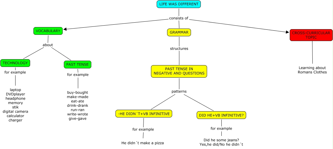Este Cmap, tiene información relacionada con: LIFE WAS DIFERENT-Víctor, CROSS-CURRICULAR TOPIC ???? Learning about Romans Clothes, GRAMMAR structures PAST TENSE IN NEGATIVE AND QUESTIONS, TECHNOLOGY for example laptop DVDplayer headphone memory stik digital camera calculator charger, -HE DIDN´T+VB INFINITIVE for example He didn´t make a pizza, PAST TENSE for example buy-bought make-made eat-ate drink-drank run-ran write-wrote give-gave, LIFE WAS DIFFERENT consists of VOCABULARY, VOCABULARY about PAST TENSE, LIFE WAS DIFFERENT consists of CROSS-CURRICULAR TOPIC, PAST TENSE IN NEGATIVE AND QUESTIONS patterns -HE DIDN´T+VB INFINITIVE, PAST TENSE IN NEGATIVE AND QUESTIONS patterns DID HE+VB INFINITIVE?, VOCABULARY about TECHNOLOGY, DID HE+VB INFINITIVE? for example Did he some jeans? Yes,he did/No he didn´t, LIFE WAS DIFFERENT consists of GRAMMAR