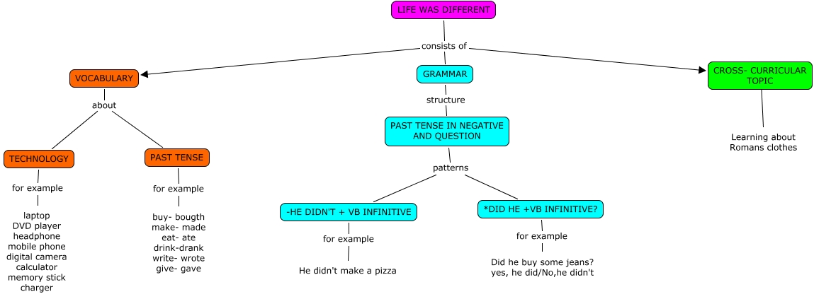 Este Cmap, tiene información relacionada con: LIFE WAS DIFFERENT-Marta, LIFE WAS DIFFERENT consists of CROSS- CURRICULAR TOPIC, LIFE WAS DIFFERENT consists of VOCABULARY, PAST TENSE for example buy- bougth make- made eat- ate drink-drank write- wrote give- gave, *DID HE +VB INFINITIVE? for example Did he buy some jeans? yes, he did/No,he didn't, TECHNOLOGY for example laptop DVD player headphone mobile phone digital camera calculator memory stick charger, PAST TENSE IN NEGATIVE AND QUESTION patterns *DID HE +VB INFINITIVE?, PAST TENSE IN NEGATIVE AND QUESTION patterns -HE DIDN'T + VB INFINITIVE, VOCABULARY about TECHNOLOGY, LIFE WAS DIFFERENT consists of GRAMMAR, CROSS- CURRICULAR TOPIC learning about Learning about Romans clothes, VOCABULARY about PAST TENSE, GRAMMAR structure PAST TENSE IN NEGATIVE AND QUESTION, -HE DIDN'T + VB INFINITIVE for example He didn't make a pizza