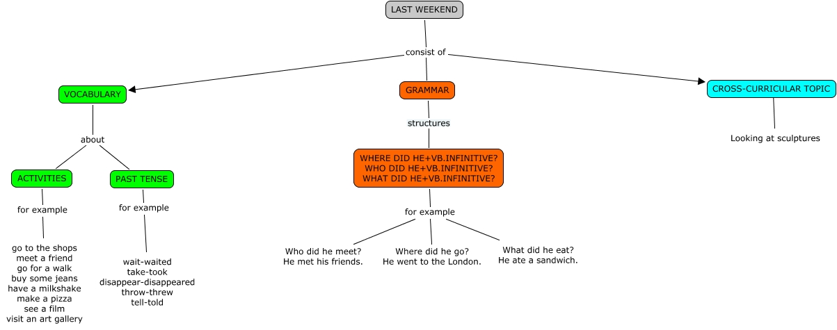 Este Cmap, tiene información relacionada con: LAST WEEKEND-Eduardo, LAST WEEKEND consist of VOCABULARY, VOCABULARY about ACTIVITIES, VOCABULARY about PAST TENSE, WHERE DID HE+VB.INFINITIVE? WHO DID HE+VB.INFINITIVE? WHAT DID HE+VB.INFINITIVE? for example Where did he go? He went to the London., LAST WEEKEND consist of GRAMMAR, WHERE DID HE+VB.INFINITIVE? WHO DID HE+VB.INFINITIVE? WHAT DID HE+VB.INFINITIVE? for example What did he eat? He ate a sandwich., PAST TENSE for example wait-waited take-took disappear-disappeared throw-threw tell-told, WHERE DID HE+VB.INFINITIVE? WHO DID HE+VB.INFINITIVE? WHAT DID HE+VB.INFINITIVE? for example Who did he meet? He met his friends., CROSS-CURRICULAR TOPIC ???? Looking at sculptures, LAST WEEKEND consist of CROSS-CURRICULAR TOPIC, ACTIVITIES for example go to the shops meet a friend go for a walk buy some jeans have a milkshake make a pizza see a film visit an art gallery, GRAMMAR structures WHERE DID HE+VB.INFINITIVE? WHO DID HE+VB.INFINITIVE? WHAT DID HE+VB.INFINITIVE?