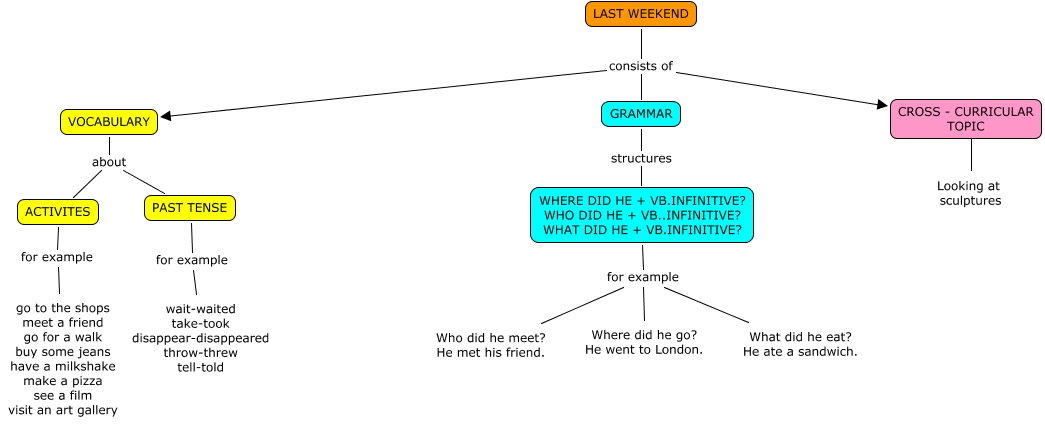 Este Cmap, tiene información relacionada con: LAST WEEKEND -Noa, LAST WEEKEND consists of CROSS - CURRICULAR TOPIC, WHERE DID HE + VB.INFINITIVE? WHO DID HE + VB..INFINITIVE? WHAT DID HE + VB.INFINITIVE? for example What did he eat? He ate a sandwich., ACTIVITES for example go to the shops meet a friend go for a walk buy some jeans have a milkshake make a pizza see a film visit an art gallery, WHERE DID HE + VB.INFINITIVE? WHO DID HE + VB..INFINITIVE? WHAT DID HE + VB.INFINITIVE? for example Where did he go? He went to London., VOCABULARY about PAST TENSE, LAST WEEKEND consists of GRAMMAR, CROSS - CURRICULAR TOPIC ???? Looking at sculptures, GRAMMAR structures WHERE DID HE + VB.INFINITIVE? WHO DID HE + VB..INFINITIVE? WHAT DID HE + VB.INFINITIVE?, VOCABULARY about ACTIVITES, LAST WEEKEND consists of VOCABULARY, PAST TENSE for example wait-waited take-took disappear-disappeared throw-threw tell-told, WHERE DID HE + VB.INFINITIVE? WHO DID HE + VB..INFINITIVE? WHAT DID HE + VB.INFINITIVE? for example Who did he meet? He met his friend.