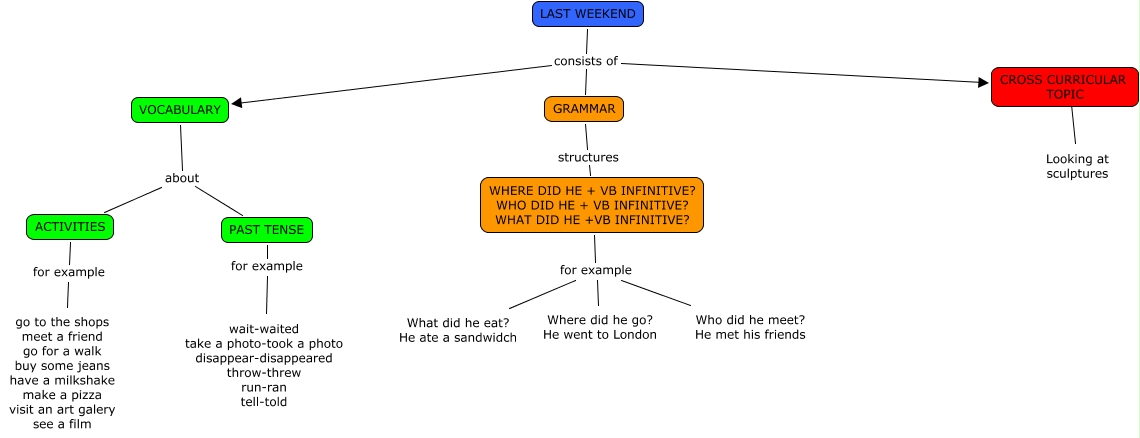 Este Cmap, tiene información relacionada con: LAST WEEKEND-Carlos, VOCABULARY about PAST TENSE, CROSS CURRICULAR TOPIC Looking at sculptures Looking at sculptures, WHERE DID HE + VB INFINITIVE? WHO DID HE + VB INFINITIVE? WHAT DID HE +VB INFINITIVE? for example What did he eat? He ate a sandwidch, WHERE DID HE + VB INFINITIVE? WHO DID HE + VB INFINITIVE? WHAT DID HE +VB INFINITIVE? for example Where did he go? He went to London, GRAMMAR structures WHERE DID HE + VB INFINITIVE? WHO DID HE + VB INFINITIVE? WHAT DID HE +VB INFINITIVE?, PAST TENSE for example wait-waited take a photo-took a photo disappear-disappeared throw-threw run-ran tell-told, LAST WEEKEND consists of CROSS CURRICULAR TOPIC, LAST WEEKEND consists of GRAMMAR, VOCABULARY about ACTIVITIES, WHERE DID HE + VB INFINITIVE? WHO DID HE + VB INFINITIVE? WHAT DID HE +VB INFINITIVE? for example Who did he meet? He met his friends, LAST WEEKEND consists of VOCABULARY, ACTIVITIES for example go to the shops meet a friend go for a walk buy some jeans have a milkshake make a pizza visit an art galery see a film