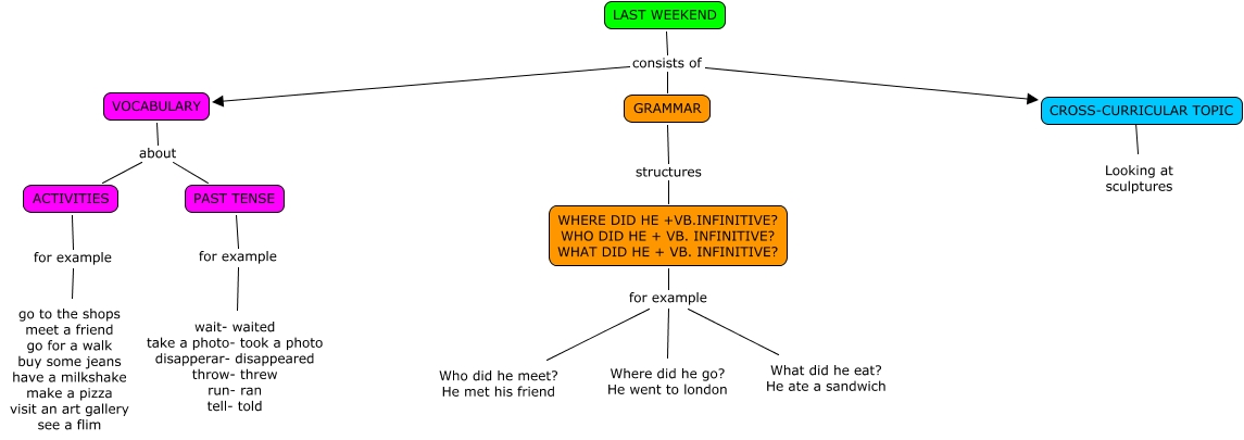 Este Cmap, tiene información relacionada con: LAST WEEKEND- Marta, VOCABULARY about PAST TENSE, LAST WEEKEND consists of CROSS-CURRICULAR TOPIC, CROSS-CURRICULAR TOPIC ???? Looking at sculptures, GRAMMAR structures WHERE DID HE +VB.INFINITIVE? WHO DID HE + VB. INFINITIVE? WHAT DID HE + VB. INFINITIVE?, ACTIVITIES for example go to the shops meet a friend go for a walk buy some jeans have a milkshake make a pizza visit an art gallery see a flim, VOCABULARY about ACTIVITIES, WHERE DID HE +VB.INFINITIVE? WHO DID HE + VB. INFINITIVE? WHAT DID HE + VB. INFINITIVE? for example What did he eat? He ate a sandwich, WHERE DID HE +VB.INFINITIVE? WHO DID HE + VB. INFINITIVE? WHAT DID HE + VB. INFINITIVE? for example Where did he go? He went to london, LAST WEEKEND consists of VOCABULARY, LAST WEEKEND consists of GRAMMAR, PAST TENSE for example wait- waited take a photo- took a photo disapperar- disappeared throw- threw run- ran tell- told, WHERE DID HE +VB.INFINITIVE? WHO DID HE + VB. INFINITIVE? WHAT DID HE + VB. INFINITIVE? for example Who did he meet? He met his friend