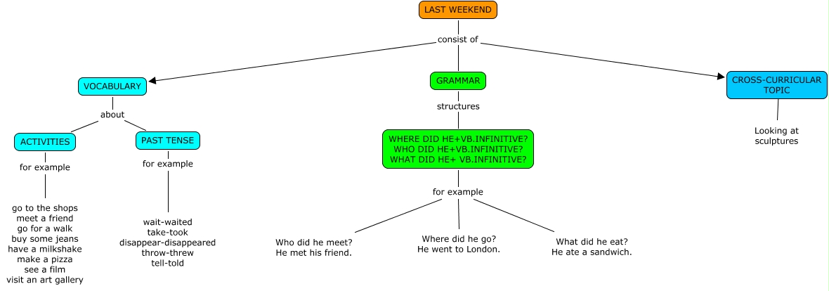 Este Cmap, tiene información relacionada con: LAST WEEKEND(Esther), WHERE DID HE+VB.INFINITIVE? WHO DID HE+VB.INFINITIVE? WHAT DID HE+ VB.INFINITIVE? for example Where did he go? He went to London., GRAMMAR structures WHERE DID HE+VB.INFINITIVE? WHO DID HE+VB.INFINITIVE? WHAT DID HE+ VB.INFINITIVE?, CROSS-CURRICULAR TOPIC ???? Looking at sculptures, LAST WEEKEND consist of CROSS-CURRICULAR TOPIC, LAST WEEKEND consist of VOCABULARY, LAST WEEKEND consist of GRAMMAR, VOCABULARY about PAST TENSE, VOCABULARY about ACTIVITIES, WHERE DID HE+VB.INFINITIVE? WHO DID HE+VB.INFINITIVE? WHAT DID HE+ VB.INFINITIVE? for example What did he eat? He ate a sandwich., WHERE DID HE+VB.INFINITIVE? WHO DID HE+VB.INFINITIVE? WHAT DID HE+ VB.INFINITIVE? for example Who did he meet? He met his friend., ACTIVITIES for example go to the shops meet a friend go for a walk buy some jeans have a milkshake make a pizza see a film visit an art gallery, PAST TENSE for example wait-waited take-took disappear-disappeared throw-threw tell-told