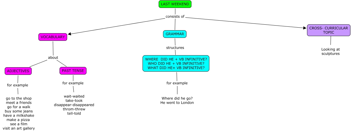 Este Cmap, tiene información relacionada con: LAST WEEKEND-Juncal, CROSS- CURRICULAR TOPIC ???? Looking at sculptures, LAST WEEKEND consists of VOCABULARY, PAST TENSE for example wait-waited take-took disappear-disappeared throm-threw tell-told, WHERE DID HE + VB INFINITIVE? WHO DID HE + VB INFINITIVE? WHAT DID HE+ VB INFINITIVE? for example Where did he go? He went to London, GRAMMAR structures WHERE DID HE + VB INFINITIVE? WHO DID HE + VB INFINITIVE? WHAT DID HE+ VB INFINITIVE?, VOCABULARY about PAST TENSE, ADJECTIVES for example go to the shop meet a friends go for a walk buy some jeans have a milkshake make a pizza see a film visit an art gallery, VOCABULARY about ADJECTIVES, LAST WEEKEND consists of GRAMMAR, LAST WEEKEND consists of CROSS- CURRICULAR TOPIC