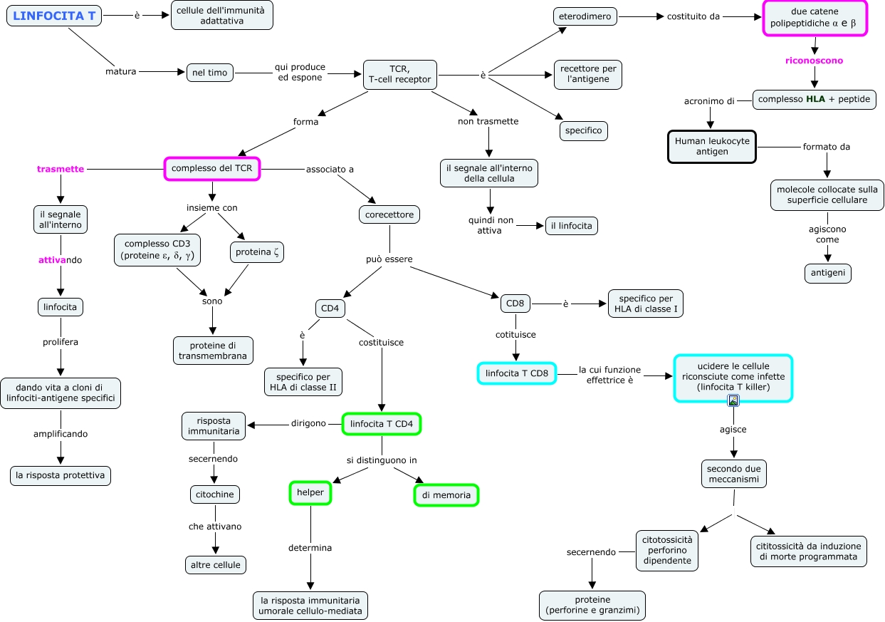 Questa Cmap, creata con IHMC CmapTools, contiene informazioni relative a: linfociti T, complesso del TCR insieme con complesso CD3 (proteine ε, δ, γ), TCR, T-cell receptor è specifico, complesso CD3 (proteine ε, δ, γ) sono proteine di transmembrana, il segnale all'interno attivando linfocita, ucidere le cellule riconsciute come infette (linfocita T killer) agisce secondo due meccanismi, citotossicità perforino dipendente secernendo proteine (perforine e granzimi), CD4 costituisce linfocita T CD4, linfocita T CD4 dirigono risposta immunitaria, due catene polipeptidiche α e β riconoscono complesso HLA + peptide, CD8 è specifico per HLA di classe I, LINFOCITA T è cellule dell'immunità adattativa, molecole collocate sulla superficie cellulare agiscono come antigeni, Human leukocyte antigen formato da molecole collocate sulla superficie cellulare, complesso del TCR associato a corecettore, linfocita T CD4 si distinguono in helper, linfocita prolifera dando vita a cloni di linfociti-antigene specifici, LINFOCITA T matura nel timo, TCR, T-cell receptor è recettore per l'antigene, linfocita T CD4 si distinguono in di memoria, CD8 cotituisce linfocita T CD8