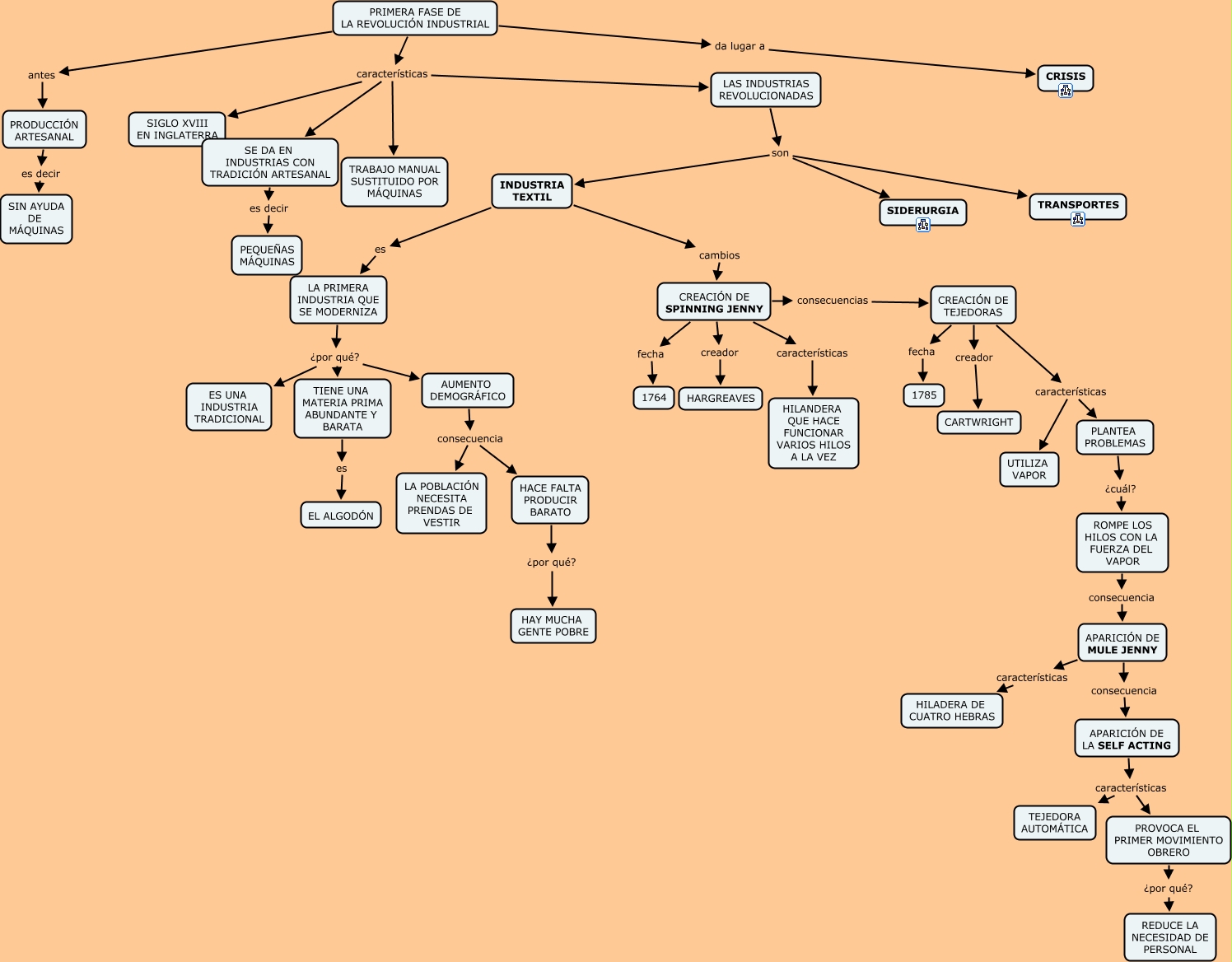 Este Cmap, tiene información relacionada con: PRIMERA FASE DE LA REVOLUCIÓN INDUSTRIAL, HACE FALTA PRODUCIR BARATO ¿por qué? HAY MUCHA GENTE POBRE, LAS INDUSTRIAS REVOLUCIONADAS son SIDERURGIA, CREACIÓN DE SPINNING JENNY consecuencias CREACIÓN DE TEJEDORAS, APARICIÓN DE LA SELF ACTING características TEJEDORA AUTOMÁTICA, LA PRIMERA INDUSTRIA QUE SE MODERNIZA ¿por qué? AUMENTO DEMOGRÁFICO, TIENE UNA MATERIA PRIMA ABUNDANTE Y BARATA es EL ALGODÓN, PRIMERA FASE DE LA REVOLUCIÓN INDUSTRIAL características LAS INDUSTRIAS REVOLUCIONADAS, PRIMERA FASE DE LA REVOLUCIÓN INDUSTRIAL características SE DA EN INDUSTRIAS CON TRADICIÓN ARTESANAL, CREACIÓN DE SPINNING JENNY características HILANDERA QUE HACE FUNCIONAR VARIOS HILOS A LA VEZ, AUMENTO DEMOGRÁFICO consecuencia LA POBLACIÓN NECESITA PRENDAS DE VESTIR, PRIMERA FASE DE LA REVOLUCIÓN INDUSTRIAL características TRABAJO MANUAL SUSTITUIDO POR MÁQUINAS, ROMPE LOS HILOS CON LA FUERZA DEL VAPOR consecuencia APARICIÓN DE MULE JENNY, CREACIÓN DE TEJEDORAS características PLANTEA PROBLEMAS, PRIMERA FASE DE LA REVOLUCIÓN INDUSTRIAL características SIGLO XVIII EN INGLATERRA, APARICIÓN DE MULE JENNY consecuencia APARICIÓN DE LA SELF ACTING, LA PRIMERA INDUSTRIA QUE SE MODERNIZA ¿por qué? TIENE UNA MATERIA PRIMA ABUNDANTE Y BARATA, LA PRIMERA INDUSTRIA QUE SE MODERNIZA ¿por qué? ES UNA INDUSTRIA TRADICIONAL, APARICIÓN DE MULE JENNY características HILADERA DE CUATRO HEBRAS, PRIMERA FASE DE LA REVOLUCIÓN INDUSTRIAL da lugar a CRISIS, LAS INDUSTRIAS REVOLUCIONADAS son INDUSTRIA TEXTIL