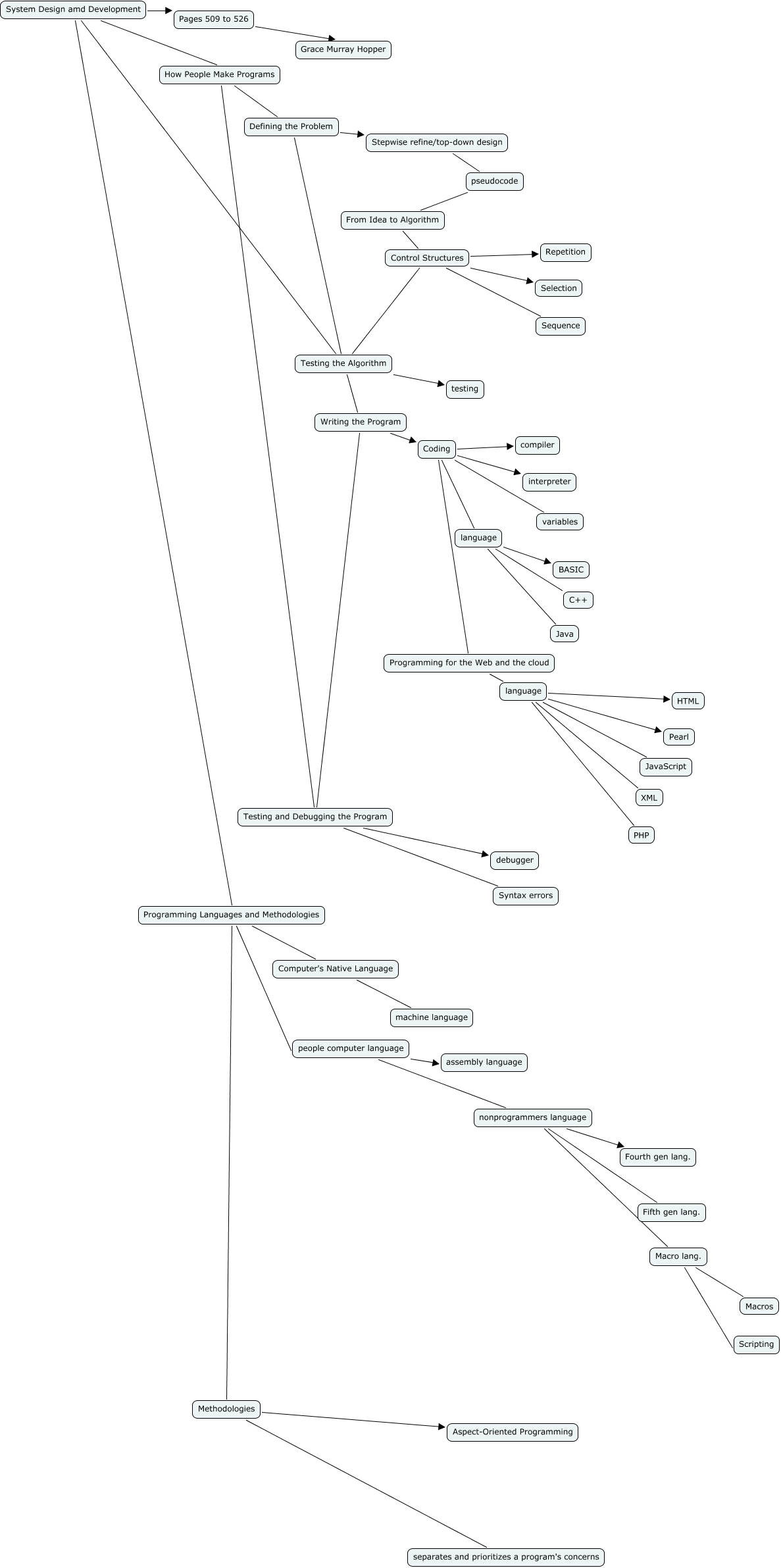 This Concept Map, created with IHMC CmapTools, has information related to: team mate version 2, Programming for the Web and the cloud language, Macro lang. Scripting, people computer language nonprogrammers language, Writing the Program Testing and Debugging the Program, Coding interpreter, Defining the Problem Stepwise refine/top-down design, Programming Languages and Methodologies Methodologies, How People Make Programs Testing and Debugging the Program, Defining the Problem Testing the Algorithm, Coding variables, Methodologies Aspect-Oriented Programming, Testing and Debugging the Program debugger, Control Structures Sequence, Testing and Debugging the Program Syntax errors, Methodologies separates and prioritizes a program's concerns, Programming Languages and Methodologies people computer language, Control Structures Repetition, language BASIC, Coding Programming for the Web and the cloud, language PHP