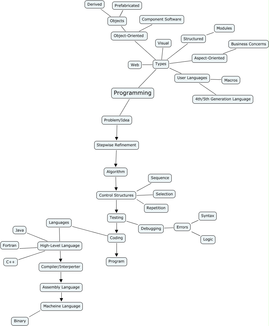 This Concept Map, created with IHMC CmapTools, has information related to: Tyler K, Debugging Errors, Objects Derived, High-Level Language Java, Programming Types, Languages High-Level Language, Compiler/Interperter Assembly Language, Control Structures Sequence, Object-Oriented Objects, Types Object-Oriented, Control Structures Testing, Errors Syntax, Types User Languages, Algorithm Control Structures, Control Structures Selection, Types Visual, Problem/Idea Stepwise Refinement, Types Web, Types Structured, High-Level Language C++, Stepwise Refinement Algorithm