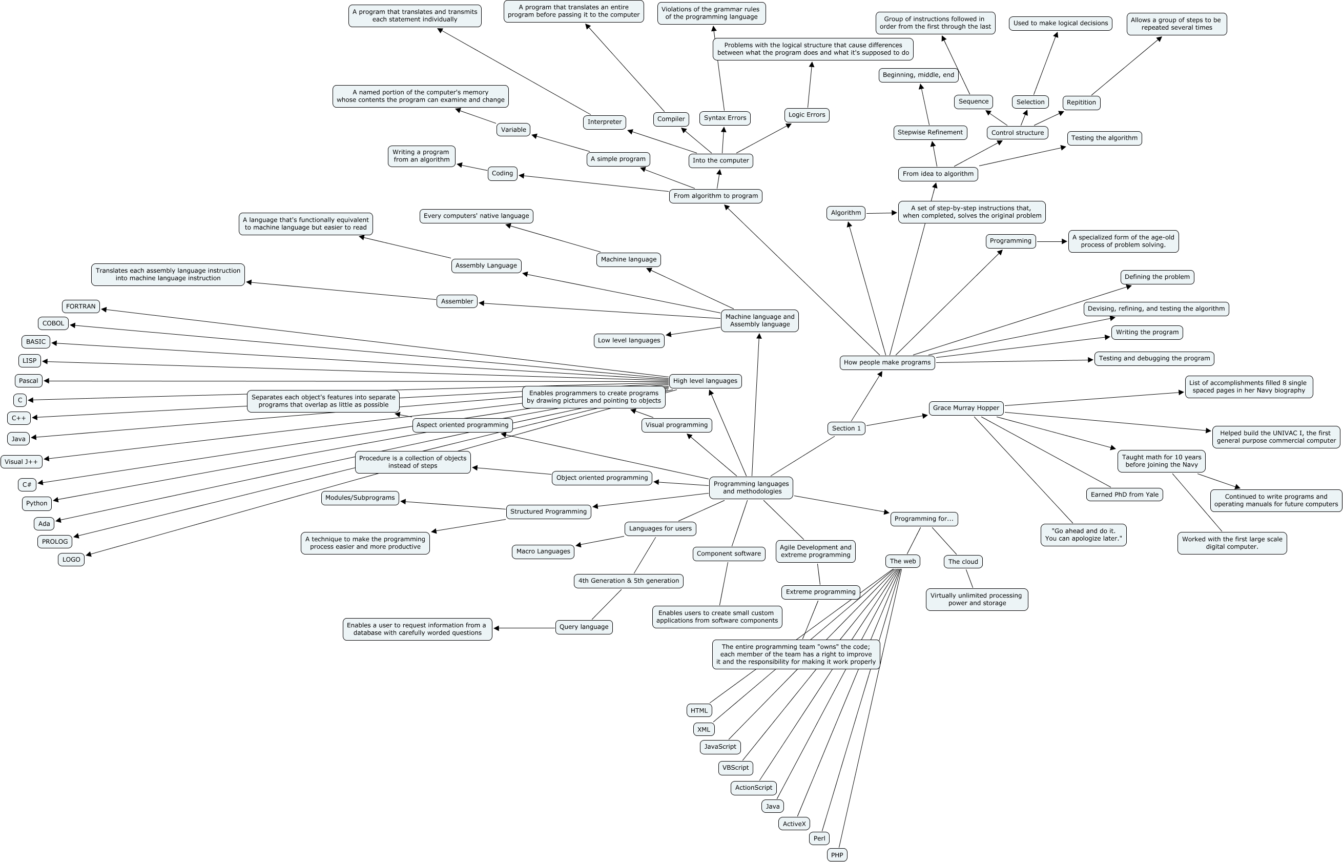 This Concept Map, created with IHMC CmapTools, has information related to: Dan L, Component software Enables users to create small custom applications from software components, Selection Used to make logical decisions, High level languages C, Machine language Every computers' native language, Control structure Selection, Compiler A program that translates an entire program before passing it to the computer, High level languages Visual J++, Section 1 Programming languages and methodologies, The web JavaScript, Section 1 Grace Murray Hopper, Programming languages and methodologies Machine language and Assembly language, How people make programs Defining the problem, Machine language and Assembly language Machine language, Coding Writing a program from an algorithm, Control structure Repitition, The web Java, Assembly Language A language that's functionally equivalent to machine language but easier to read, High level languages FORTRAN, From algorithm to program A simple program, How people make programs From idea to algorithm