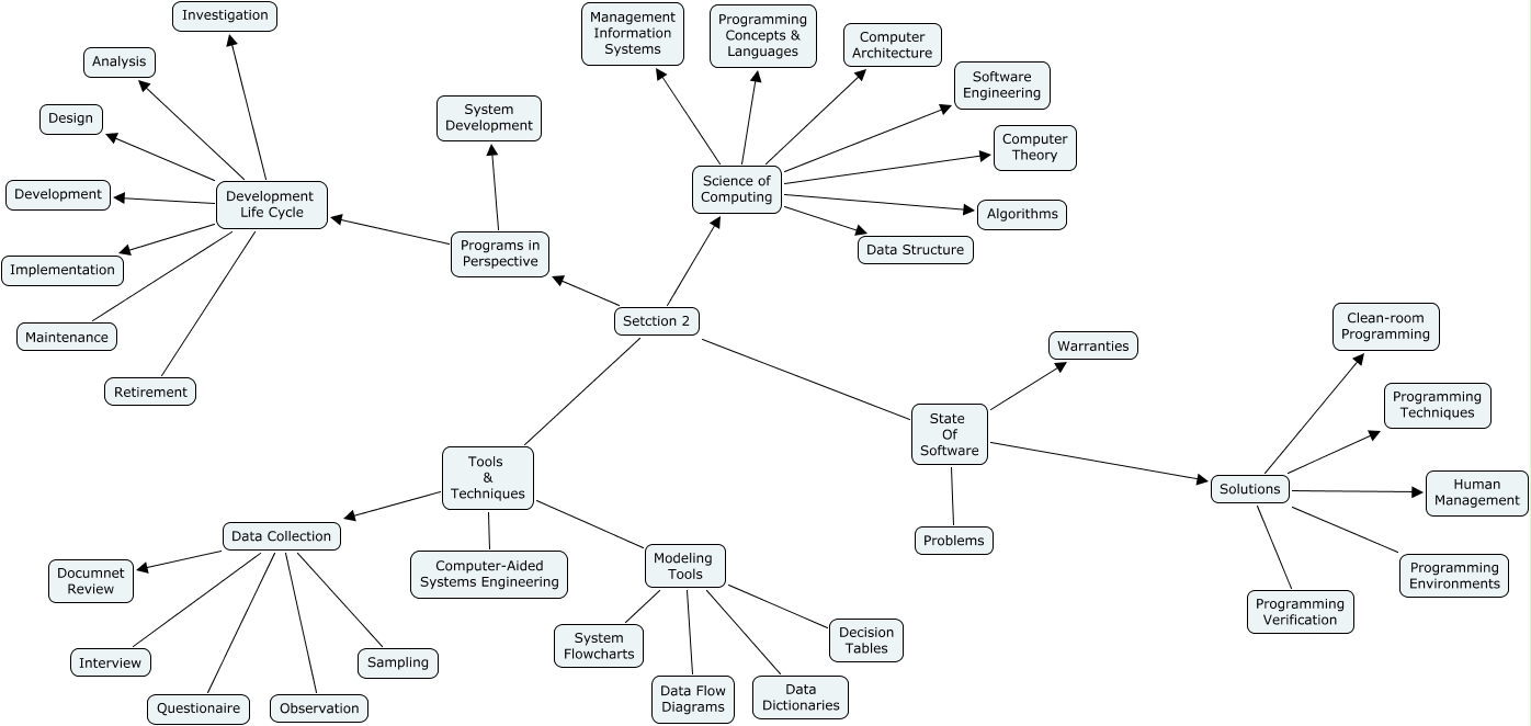 This Concept Map, created with IHMC CmapTools, has information related to: Seth B, Science of Computing Data Structure, Solutions Human Management, Solutions Clean-room Programming, Development Life Cycle Investigation, Development Life Cycle Maintenance, Science of Computing Algorithms, Development Life Cycle Design, Setction 2 Programs in Perspective, Development Life Cycle Retirement, Science of Computing Management Information Systems, Modeling Tools Data Flow Diagrams, Setction 2 Science of Computing, Tools & Techniques Data Collection, Data Collection Interview, State Of Software Solutions, Science of Computing Software Engineering, Data Collection Observation, Science of Computing Computer Theory, State Of Software Warranties, State Of Software Problems