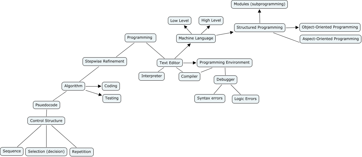 This Concept Map, created with IHMC CmapTools, has information related to: Trevor H, Debugger Logic Errors, Control Structure Sequence, Structured Programming Object-Oriented Programming, Control Structure Repetition, Text Editor Machine Language, Programming Environment Debugger, Stepwise Refinement Algorithm, Text Editor Compiler, Debugger Syntax errors, Text Editor Programming Environment, Structured Programming Modules (subprogramming), Machine Language Low Level, Programming Text Editor, Algorithm Coding, Text Editor Interpreter, Structured Programming Aspect-Oriented Programming, Algorithm Psuedocode, Programming Environment Compiler, Programming Stepwise Refinement, Machine Language High Level