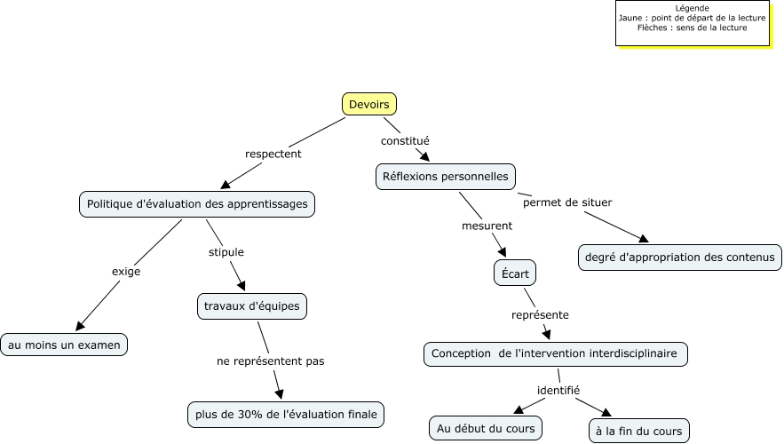 Cette carte de concepts créée avec IHMC CmapTools traite de: Devoirs, Devoirs constitué Réflexions personnelles, Politique d'évaluation des apprentissages exige au moins un examen, Écart représente Conception de l'intervention interdisciplinaire, Conception de l'intervention interdisciplinaire identifié à la fin du cours, Réflexions personnelles permet de situer degré d'appropriation des contenus, Réflexions personnelles mesurent Écart, Politique d'évaluation des apprentissages stipule travaux d'équipes, Conception de l'intervention interdisciplinaire identifié Au début du cours, Devoirs respectent Politique d'évaluation des apprentissages, travaux d'équipes ne représentent pas plus de 30% de l'évaluation finale