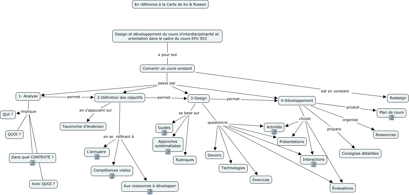 Cette carte de concepts créée avec IHMC CmapTools traite de: Design et développement du cours d'interdisciplinarité et orientation, Convertir un cours existant passe par 3-Design, 1- Analyse implique Dans quel CONTEXTE ?, 2-Définition des objectifs en se référant à L'annuaire, Design et développement du cours d'interdisciplinarité et orientation dans le cadre du cours EPU 953 a pour but Convertir un cours existant, 4-Développement produit Plan de cours, 4-Développement choisit Activités, 4-Développement organise Ressources, Convertir un cours existant est en constant Redesign, 3-Design se base sur Rubriques, 1- Analyse implique Avec QUOI ?, 1- Analyse permet 2-Définition des objectifs, 3-Design questionne Technologies, 3-Design se base sur Approches systématisées, Convertir un cours existant passe par 1- Analyse, Convertir un cours existant passe par 2-Définition des objectifs, Convertir un cours existant passe par 4-Développement, 4-Développement prépare Consignes détaillées, 4-Développement choisit Présentations, 3-Design permet 4-Développement, 3-Design questionne Devoirs
