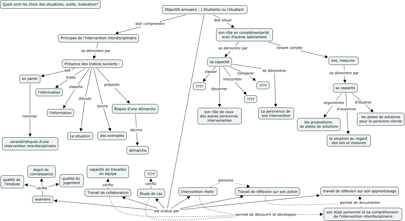 Cette carte de concepts créée avec IHMC CmapTools traite de: Choix Outils, Présence des Indices suivants : classifie l'information, Intervention réelle permet de découvrir et développer son style personnel et sa compréhension de l'intervention interdisciplinaire, examens vérifie qualité de l'analyse, Objectifs annuaire : L'étudiante ou l'étudiant est évalué par Travail de collaboration, Objectifs annuaire : L'étudiante ou l'étudiant doit situer son rôle en complémentarité avec d'autres spécialistes, Objectifs annuaire : L'étudiante ou l'étudiant est évalué par Intervention réelle, en parler nommer caractéristiques d'une intervention interdisciplinaire, Présence des Indices suivants : sait en parler, Objectifs annuaire : L'étudiante ou l'étudiant est évalué par travail de réflexion sur son apprentissage, son rôle en complémentarité avec d'autres spécialistes se démontre par sa capacité, sa capacité discerner son rôle de ceux des autres personnes intervenantes, Intervention réelle alimente Travail de réflexion sur son action, sa capacité comparer ????, sa capacité de démontrer La pertinence de son intervention, Objectifs annuaire : L'étudiante ou l'étudiant est évalué par Étude de cas, examens vérifie qualité du jugement, Objectifs annuaire : L'étudiante ou l'étudiant est évalué par examens, Étapes d'une démarche décrire démarche, Présence des Indices suivants : discute La situation, Principes de l'intervention interdisciplinaire se démontre par Présence des Indices suivants :