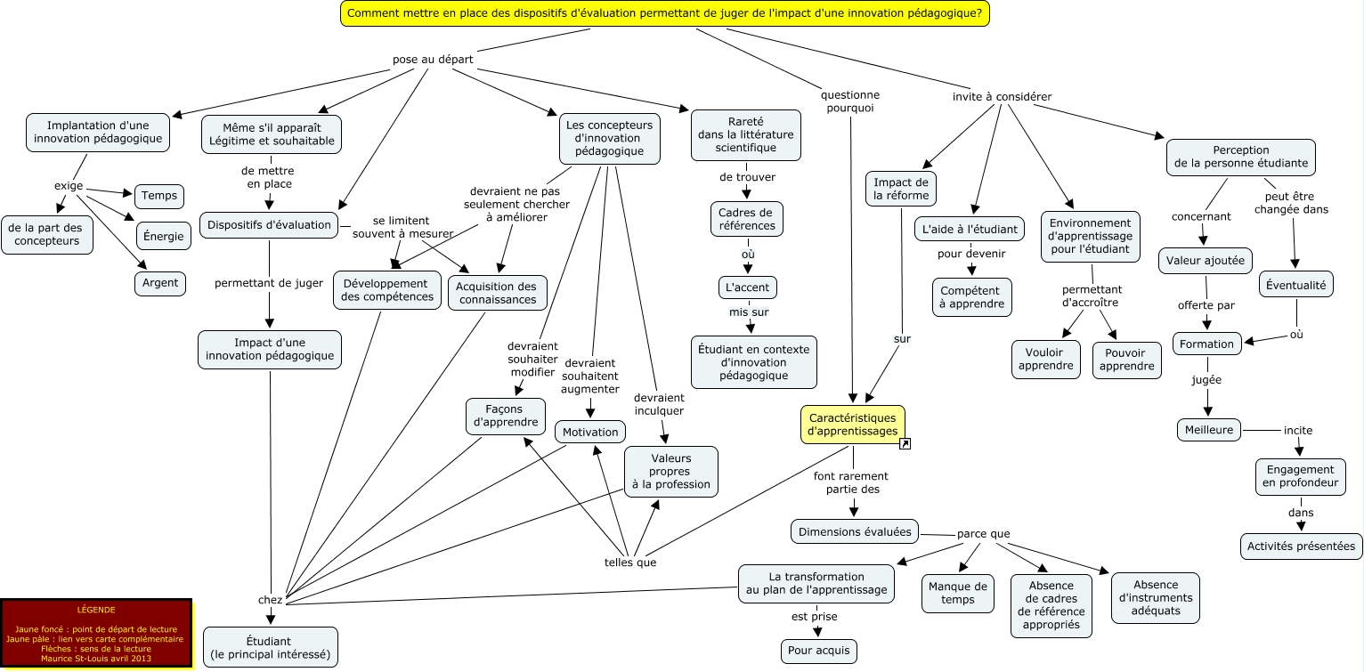 Cette carte de concepts créée avec IHMC CmapTools traite de: Chapitre 11 Rolland Viau L'impact d'une innovation pédagogique _ au-delà des connaissances et des compétences, Impact de la réforme sur Caractéristiques d'apprentissages, Dispositifs d'évaluation se limitent souvent à mesurer Acquisition des connaissances, Formation jugée Meilleure, Engagement en profondeur dans Activités présentées, Implantation d'une innovation pédagogique exige Énergie, Motivation chez Étudiant (le principal intéressé), Comment mettre en place des dispositifs d'évaluation permettant de juger de l'impact d'une innovation pédagogique? invite à considérer Perception de la personne étudiante, Caractéristiques d'apprentissages telles que Façons d'apprendre, Caractéristiques d'apprentissages font rarement partie des Dimensions évaluées, La transformation au plan de l'apprentissage chez Étudiant (le principal intéressé), La transformation au plan de l'apprentissage est prise Pour acquis, Valeurs propres à la profession chez Étudiant (le principal intéressé), L'accent mis sur Étudiant en contexte d'innovation pédagogique, Comment mettre en place des dispositifs d'évaluation permettant de juger de l'impact d'une innovation pédagogique? pose au départ Implantation d'une innovation pédagogique, Comment mettre en place des dispositifs d'évaluation permettant de juger de l'impact d'une innovation pédagogique? invite à considérer L'aide à l'étudiant, Implantation d'une innovation pédagogique exige Temps, Dispositifs d'évaluation se limitent souvent à mesurer Développement des compétences, Comment mettre en place des dispositifs d'évaluation permettant de juger de l'impact d'une innovation pédagogique? pose au départ Rareté dans la littérature scientifique, Les concepteurs d'innovation pédagogique devraient inculquer Valeurs propres à la profession, Environnement d'apprentissage pour l'étudiant permettant d'accroître Pouvoir apprendre
