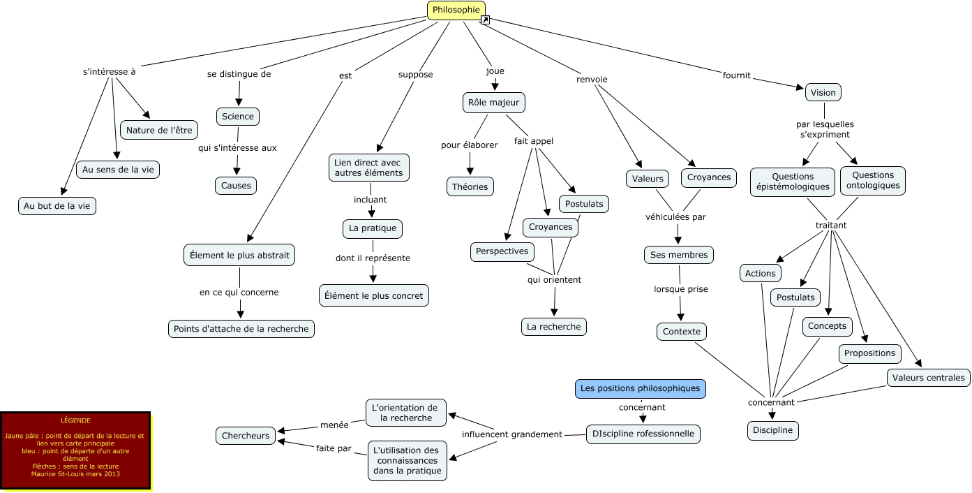 Cette carte de concepts créée avec IHMC CmapTools traite de: Philosophie, Questions épistémologiques traitant Concepts, Ses membres lorsque prise Contexte, Philosophie suppose Lien direct avec autres éléments, Questions épistémologiques traitant Postulats, Rôle majeur fait appel Croyances, La pratique dont il représente Élément le plus concret, Philosophie s'intéresse à Au sens de la vie, DIscipline rofessionnelle influencent grandement L'orientation de la recherche, Actions concernant Discipline, Lien direct avec autres éléments incluant La pratique, Questions ontologiques traitant Propositions, Philosophie se distingue de Science, Croyances véhiculées par Ses membres, Élement le plus abstrait en ce qui concerne Points d'attache de la recherche, Perspectives qui orientent La recherche, Questions ontologiques traitant Concepts, Croyances qui orientent La recherche, Rôle majeur fait appel Postulats, Contexte concernant Discipline, DIscipline rofessionnelle influencent grandement L'utilisation des connaissances dans la pratique