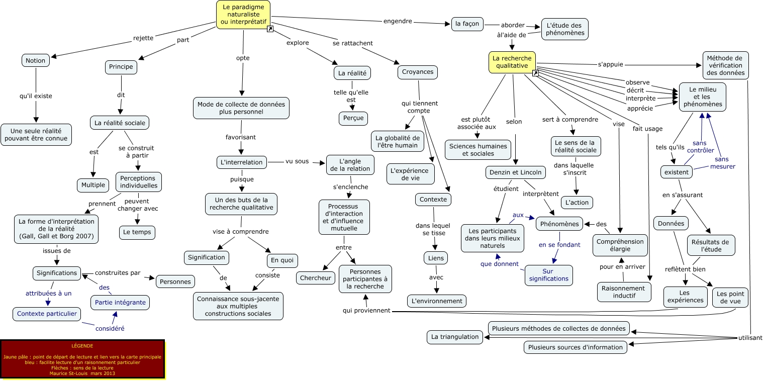 Cette carte de concepts créée avec IHMC CmapTools traite de: Le paradigme naturaliste ou interprétatif, Le paradigme naturaliste ou interprétatif se rattachent Croyances, Croyances qui tiennent compte La globalité de l'être humain, Denzin et Lincoln interprètent Phénomènes, Significations construites par Personnes, Perceptions individuelles peuvent changer avec Le temps, La recherche qualitative sert à comprendre Le sens de la réalité sociale, Contexte dans lequel se tisse Liens, existent en s'assurant Résultats de l'étude, Personnes participantes à la recherche entre Chercheur, La recherche qualitative s'appuie Méthode de vérification des données, Croyances qui tiennent compte Contexte, La réalité telle qu'elle est Perçue, Liens avec L'environnement, La recherche qualitative interprète Le milieu et les phénomènes, Le paradigme naturaliste ou interprétatif part Principe, Phénomènes en se fondant Sur significations, Principe dit La réalité sociale, La réalité sociale se construit à partir Perceptions individuelles, Processus d'interaction et d'influence mutuelle entre Personnes participantes à la recherche, Mode de collecte de données plus personnel favorisant L'interrelation